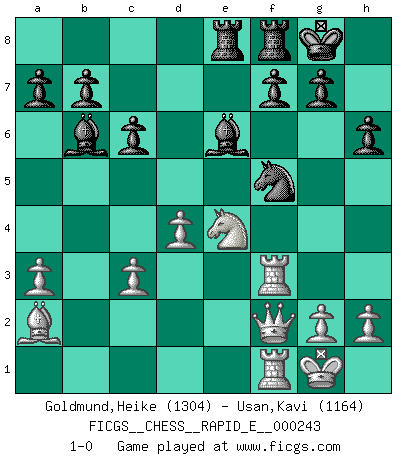 Last move : 1-0 2021 June 14 17:56:59 [Event "FICGS__CHESS__RAPID_E__000243"] [Site "FICGS"] [Date "2021.03.31"] [Round "1"] [White "Goldmund,Heike"] [Black "Usan,Kavi"] [Result "1-0"] [WhiteElo "1304"] [BlackElo "1164"] 1.b4 e5 2.Bb2 Qf6 3.Nf3 e4 4.Bxf6 Nxf6 5.Ng5 Bxb4 6.e3 O-O 7.Bc4 d5 8.Bb3 Na6 9.a3 Ba5 10.O-O Nc5 11.Ba2 c6 12.Qe1 Be6 13.f3 exf3 14.Rxf3 Bb6 15.Qh4 Nce4 16.Nxe4 Nxe4 17.d3 Nd6 18.Nd2 Nf5 19.Qf2 h6 20.d4 Ba5 21.Nb3 Bb6 22.Re1 Rae8 23.Nd2 Ba5 24.Rf1 Bc7 25.e4 dxe4 26.Nxe4 Bb6 27.c3 1-0 Polish (Sokolsky) opening Kingside Castling by player Black (move 6) Kingside Castling by player White (move 10) Player White won this chess game. Follow this game move after move (download)Adequate compensation for a sacrifice is having a sound combination leading to a winning position; adequate compensation for a blunder is having your opponent snatch defeat from the jaws of victory. (Bruce A. Moon) Es ist schade, dass viele Schachsportler vergessen, wie wichtig Auftreten und angemessene Kleidung sind. (Alexandra Kosteniuk) El sobresalir en el Ajedrez es un signo de una mente intrigante. (Sir Arthur Conan Doyle) A ce moment-là, je menaçais de comprendre la position ! (Clément L'Heureux) Just because you do not take an interest in politics doesn't mean politics won't take an interest in you. (Pericles 430 B.C.)