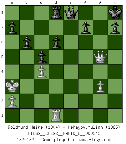 Last move : 1/2-1/2 2021 May 19 12:55:3 [Event "FICGS__CHESS__RAPID_E__000243"] [Site "FICGS"] [Date "2021.03.31"] [Round "1"] [White "Goldmund,Heike"] [Black "Kehayov,Yulian"] [Result "1/2-1/2"] [WhiteElo "1304"] [BlackElo "1365"] 1.b4 e5 2.Bb2 Bxb4 3.Bxe5 Nf6 4.c4 Nc6 5.Qb3 O-O 6.Bb2 Ne4 7.Nf3 d6 8.Nd4 Nxd4 9.Bxd4 Bc5 10.Bb2 Qh4 11.g3 Qg4 12.f3 Qe6 13.fxe4 Qxe4 14.Rg1 Bxg1 15.Nc3 Qf5 16.Nd5 Qf2+ 17.Kd1 Qxf1+ 18.Kc2 Bf5+ 19.Kc3 Qxe2 20.Rxg1 Qd3+ 21.Kb4 c5+ 22.Ka3 Qxd2 23.Rd1 Qxh2 24.Ne7+ Kh8 25.Nxf5 b6 26.Bxg7+ Kg8 27.Qc3 Rfe8 28.Bh6 Re3 29.Nxe3 Qxh6 30.Nf5 Qg5 31.Ne7+ Qxe7 32.Qf3 Qe8 33.Qg4+ Kh8 34.Qf4 Rd8 35.Qf6+ Kg8 36.Qg5+ Kh8 1/2-1/2 Polish (Sokolsky) opening Kingside Castling by player Black (move 5) This chess game ended in a draw. Follow this game move after move (download)If a ruler does not understand Chess, how can he rule over a kingdom ? (King Khusros II) Ein Remis kann durch Wiederholung von drei Zügen oder durch einen schlechte Zug erreicht werden. (Savielly Grigorievitsch Tartakower) No soy una persona materialista y por eso, no resiento la falta o pérdida del dinero. La ausencia de cosas mundanas carece de importancia. Ya que el Ajedrez es una forma en la que puedo ser tan materialista como yo desee sin tener la necesidad de vender mi alma. (Jamie Walter Adams) D'abord les bases : Jouez et étudiez, puis étudiez et jouez, ensuite jouez et étudiez, puis étudiez et jouez. Deuxièmement : Donnez toujours le meilleur de vous-même ! (Ken Smith) I know the human being and fish can coexist peacefully. (George W. Bush, Saginaw sept. 29, 2000)