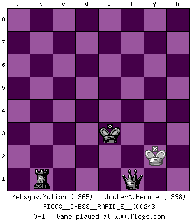Last move : 0-1 2021 July 23 9:43:19 [Event "FICGS__CHESS__RAPID_E__000243"] [Site "FICGS"] [Date "2021.03.31"] [Round "1"] [White "Kehayov,Yulian"] [Black "Joubert,Hennie"] [Result "0-1"] [WhiteElo "1365"] [BlackElo "1398"] 1.e4 c5 2.Nf3 e6 3.d4 cxd4 4.Nxd4 Nf6 5.Nc3 Qb6 6.e5 Bc5 7.Be3 Nd5 8.Nxd5 exd5 9.Be2 Nc6 10.Nf5 O-O 11.Qxd5 Bxe3 12.Nxe3 Qxb2 13.O-O Qxe5 14.Qxe5 Nxe5 15.Nc4 Nxc4 16.Bxc4 d6 17.Bd5 Rb8 18.Rad1 Bf5 19.Bb3 Rbd8 20.h3 Be6 21.Bxe6 fxe6 22.Rd2 d5 23.Re1 Rfe8 24.Kh1 e5 25.Kg1 d4 26.Kh2 Kf7 27.Kg1 e4 28.Kh2 Kf6 29.Kg1 Kf5 30.Kh2 Kf4 31.R2d1 b5 32.Kg1 a5 33.Kh2 g5 34.Rd2 h5 35.Red1 Ke5 36.Kg1 b4 37.Kf1 a4 38.Kg1 d3 39.cxd3 exd3 40.Rxd3 Rxd3 41.Rxd3 Rb8 42.Kf1 b3 43.axb3 axb3 44.Re3+ Kd4 45.Re1 b2 46.Rb1 Kd3 47.g4 hxg4 48.hxg4 Kc2 49.Rxb2+ Rxb2 50.Kg2 Kd3 51.Kg3 Ke4 52.f4 gxf4+ 53.Kh3 f3 54.g5 Kf5 55.g6 Kxg6 56.Kg3 f2 57.Kg2 Kf5 58.Kf1 Kf4 59.Kg2 Ke3 60.Kf1 Rb1+ 61.Kg2 f1Q+ 0-1 Sicilian : Anderssen variation Kingside Castling by player Black (move 10) Kingside Castling by player White (move 13) 10 pieces endgame at move 43 : White KRPPP , Black KRPPP WHITE : King + 1 Rook 3 Pawns BLACK : King + 1 Rook 3 Pawns 9 pieces endgame at move 47 : White KRPP , Black KRPPP WHITE : King + 1 Rook 2 Pawns BLACK : King + 1 Rook 3 Pawns 8 pieces endgame at move 48 : White KRPP , Black KRPP WHITE : King + 1 Rook 2 Pawns BLACK : King + 1 Rook 2 Pawns 7 pieces endgame at move 49 : White KRPP , Black KRP WHITE : King + 1 Rook 2 Pawns BLACK : King + 1 Rook 1 Pawn 6 pieces endgame at move 49 : White KPP , Black KRP WHITE : King + 2 Pawns BLACK : King + 1 Rook 1 Pawn 5 pieces endgame at move 52 : White KP , Black KRP WHITE : King + 1 Pawn BLACK : King + 1 Rook 1 Pawn 4 pieces endgame at move 55 : White K , Black KRP WHITE : King + BLACK : King + 1 Rook 1 Pawn Promotion Queen by player Black (move 61) Player Black won this chess game. Follow this game move after move (download)All my games are real. (Bobby Fischer) Heutzutage gewinnt im Turnier nicht derjenige Spieler, der weitreichende Pläne entwirft, sondern einfach jener, der Zug um Zug kämpft. (David Bronstein) El Ajedrez es imaginación. (David Bronstein) J'ai toujours senti une vague pitié pour l'homme qui ne connaît rien aux échecs, tout comme j'en aurais pour un homme ignorant de l'amour. Les Echecs, comme la musique ou comme l'amour, ont le pouvoir de rendre heureux. (Siegbert Tarrasch) Life is like a ten-speed bicycle: most of us have gears we never use. (Charles M. Schulz)