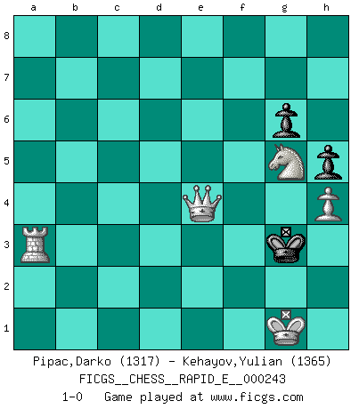 Last move : 1-0 2021 May 16 16:16:26 [Event "FICGS__CHESS__RAPID_E__000243"] [Site "FICGS"] [Date "2021.03.31"] [Round "1"] [White "Pipac,Darko"] [Black "Kehayov,Yulian"] [Result "1-0"] [WhiteElo "1317"] [BlackElo "1365"] 1.e4 c5 2.Nf3 d6 3.h3 Nf6 4.b3 e5 5.Bb5+ Bd7 6.Bxd7+ Qxd7 7.d3 Be7 8.Nc3 O-O 9.Bg5 Nh5 10.Bxe7 Qxe7 11.O-O Nc6 12.Nd5 Qd8 13.Qd2 Nf6 14.Nxf6+ Qxf6 15.a3 b5 16.b4 cxb4 17.axb4 Qe6 18.Qc3 Rfc8 19.Qd2 d5 20.Ra6 dxe4 21.dxe4 Qe7 22.c3 Rd8 23.Qe3 h6 24.Rxc6 a5 25.Qc5 Qxc5 26.Rxc5 axb4 27.cxb4 f6 28.Rxb5 Kh7 29.Rb7 Kg8 30.Rb1 Kh7 31.b5 Kg8 32.b6 Kh7 33.Ra7 Rxa7 34.bxa7 Ra8 35.Rb7 h5 36.Nd2 Kh6 37.Nc4 Rxa7 38.Rxa7 g6 39.Ra6 Kg5 40.g3 f5 41.exf5 Kxf5 42.Nd6+ Kg5 43.f3 e4 44.fxe4 Kh6 45.Nf7+ Kg7 46.Ng5 Kh6 47.h4 Kg7 48.e5 Kh6 49.e6 Kg7 50.Ra7+ Kf6 51.e7 Kf5 52.e8Q Kg4 53.Qe4+ Kxg3 54.Ra3+ 1-0 Sicilian Kingside Castling by player Black (move 8) Kingside Castling by player White (move 11) 10 pieces endgame at move 41 : White KRNPPP , Black KPPP WHITE : King + 1 Rook 1 Knight 3 Pawns BLACK : King + 3 Pawns 9 pieces endgame at move 44 : White KRNPPP , Black KPP WHITE : King + 1 Rook 1 Knight 3 Pawns BLACK : King + 2 Pawns Promotion Queen by player White (move 52) 8 pieces endgame at move 53 : White KQRNP , Black KPP WHITE : King + 1 Queen 1 Rook 1 Knight 1 Pawn BLACK : King + 2 Pawns Player White won this chess game. Follow this game move after move (download)Good positions don't win games, good moves do. (Gerald Abrahams) Kein Großmeister ist normal. Sie unterscheiden sich nur im Ausmaß Ihrer Verrücktheit. (Viktor Kortschnoi) Siempre es mejor sacrificar los hombres de tu oponente. (Savielly Tartakower) Pour moi, les échecs ne sont pas un jeu mais un art. (Alexandre Alekhine) The man who strikes first admits that his ideas have given out. (Chinese proverb)