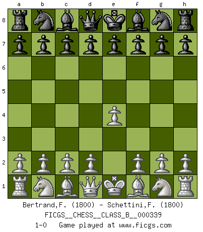 Last move : 1-0 2021 May 11 16:44:12 [Event "FICGS__CHESS__CLASS_B__000339"] [Site "FICGS"] [Date "2021.04.01"] [Round "1"] [White "Bertrand,Francis"] [Black "Schettini,Fabricio"] [Result "1-0"] [WhiteElo "1800"] [BlackElo "1800"] 1.e4 1-0 This chess game has been lost on time (started : 2021.04.01 12:34:12) King's pawn Opening Player White won this chess game. Follow this game move after move (download)We like to think. (Gary Kasparov) Versuche, dich von der Sklaverei der Eröffnungsvarianten zu befreien. Stattdessen soll man gewisse Typenpositionen erlernen, die man eingehend analysiert. (Aaron Nimzowitsch) Con el fin de mejorar tu juego, debes de estudiar los finales antes que todo, ya que mientras que los finales pueden ser estudiados y dominados por sí mismos, el juegomedio y la apertura deben de ser estudiados en relación con los finales. (José Raúl Capablanca) Mais l'homme est une créature légère et illogique : semblable au joueur d'échecs, il n'aime que le processus du but à atteindre, non le but lui-même. (Dostoïevsky) He who defends everything defends nothing. (Frederick the Great)