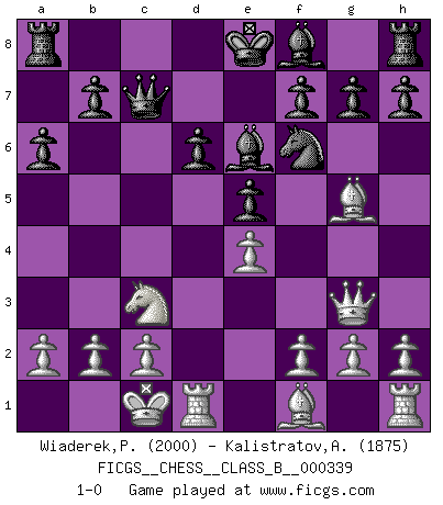 Last move : 1-0 2021 June 26 11:3:36 [Event "FICGS__CHESS__CLASS_B__000339"] [Site "FICGS"] [Date "2021.04.01"] [Round "1"] [White "Wiaderek,Piotr"] [Black "Kalistratov,Aleksandr"] [Result "1-0"] [WhiteElo "2000"] [BlackElo "1875"] 1.e4 c5 2.Nf3 Nc6 3.Nc3 e6 4.d4 cxd4 5.Nxd4 Qc7 6.Be3 a6 7.Qf3 Nf6 8.O-O-O Nxd4 9.Bxd4 e5 10.Be3 d6 11.Qg3 Be6 12.Bg5 1-0 This chess game has been lost on time (started : 2021.04.01 12:34:12) Sicilian defense Queenside Castling by player White (move 8) Player White won this chess game. Follow this game move after move (download)All that matters on the Chessboard is good moves. (Bobby Fischer) Viele Opfer benötigen überhaupt keine konkrete Berechnung. Es genügt sich die entstehende Position kurz vorzustellen, um uns davon zu überzeugen, dass das Opfer korrekt ist. (Mikhail Nekhemyevich Tal) El Ajedrez es un mar en el cual un mosquito puede beber y un elefante puede bañarse. (Refrán Hindú) Les écrivains ont utilisé les échecs pour analyser les côtés extrêmes de la nature humaine. Dans ce cadre, les échecs offrent un champ d'expérimentation idéal. Mais on pourrait faire la même chose avec la peinture. Et là, en vous référant à Van Gogh, vous ne tirerez pas de conclusion définitive sur les peintres. (Gary Kasparov) I couldn't make any sense out of what this particular thread is about. It sounds like R2 D2 computer speaking. A space fight ?!? Some 'command' problems in Moscow ? Some killers & narcotic addicts attacking some game & a god wannabe ?? (Dinesh De Silva, lost in a russian conflict in FICGS forum)