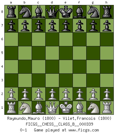 Last move : 0-1 2021 May 11 16:44:12 [Event "FICGS__CHESS__CLASS_B__000339"] [Site "FICGS"] [Date "2021.04.01"] [Round "1"] [White "Raymundo,Mauro"] [Black "Rapier,France"] [Result "0-1"] [WhiteElo "1800"] [BlackElo "1800"] 0-1 This chess game has been lost on time (started : 2021.04.01 12:34:12) Player Black won this chess game. Follow this game move after move (download)I'm not afraid of Spassky. The world knows I'm the best. You don't need a match to prove it. (Bobby Fischer) Ohne Fehler kann es keine Brillanz geben. (Emanuel Lasker) Jugadores de primera clase pierden en contra de jugadores de segunda clase porque los jugadores de segunda clase a veces juegan una partida de primer clase. (Siegbert Tarrasch) Avant la finale, les dieux ont créé le milieu de partie. (Tarrasch) There is a great deal of difference between an eager man who wants to read a book and a tired man who wants a book to read. (G.K. Chesterton)