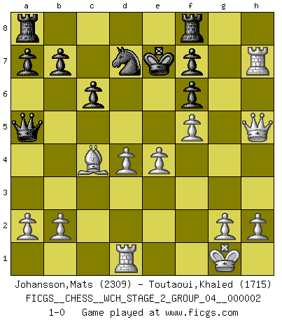 Last move : 1-0 2007 October 11 17:25:19 [Event "FICGS__CHESS__WCH_STAGE_2_GROUP_04__000002"] [Site "FICGS"] [Date "2007.07.11"] [Round "1"] [White "Johansson,Mats"] [Black "Toutaoui,Khaled"] [Result "1-0"] [WhiteElo "2309"] [BlackElo "1715"] 1.d4 d5 2.c4 e6 3.Nc3 Nf6 4.cxd5 exd5 5.Bg5 Be7 6.e3 O-O 7.Bd3 c6 8.Qc2 Nbd7 9.Nge2 Re8 10.O-O Nf8 11.f3 Ng6 12.Rad1 Qc7 13.Bxf6 Bxf6 14.Nxd5 Qa5 15.Nxf6+ gxf6 16.e4 Be6 17.f4 Bg4 18.f5 Nf8 19.Rf4 Bxe2 20.Qxe2 Nd7 21.Rh4 Kf8 22.Rxh7 Ke7 23.Bc4 Rf8 24.Qh5 1-0 QGD : Exchange, positional line Kingside Castling by player Black (move 6) Kingside Castling by player White (move 10) Player White won this chess game. Follow this game move after move (download)Fischer is completely natural. He plays no roles. He's like a child. Very, very simple. (Zita Rajcsanyi) Schach ist ein Reich, wo sich die menschliche Phantasie frei entfalten kann. (David Bronstein) El Ajedrez lo es todo: arte, ciencia y deporte. (Anatoly Karpov) La tactique, c'est ce que vous faites quand il y a quelque chose à faire; la stratégie, c'est ce que vous faites quand il n'y a rien à faire. (Savielli Tartacower) Wisdom doesn't necessarily come with age. Sometimes age just shows up all by itself. (Tom Watson)
