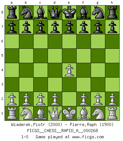 Last move : 1-0 2021 May 2 2:9:31 [Event "FICGS__CHESS__RAPID_A__000268"] [Site "FICGS"] [Date "2021.04.01"] [Round "1"] [White "Wiaderek,Piotr"] [Black "Pierre,Raph"] [Result "1-0"] [WhiteElo "2000"] [BlackElo "1900"] 1.e4 1-0 This chess game has been lost on time (started : 2021.04.01 13:31:46) King's pawn Opening Player White won this chess game. Follow this game move after move (download)The blunders are all there on the board, waiting to be made. (Savielly Tartakover) Ein Teil des Fehlers ist immer korrekt. (Savielly Grigorievitsch Tartakower) Dejen al perfeccionista jugar por correo. (Yasser Seirawan) Seul un grand joueur sait à quel point il joue faiblement. (Xavier Tartacover) Being number two sucks. (Andre Agassi)