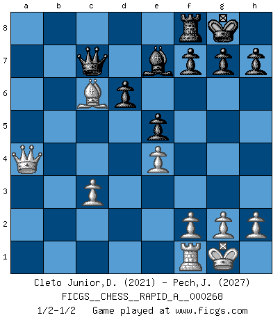 Last move : 1/2-1/2 2021 June 2 4:6:51 [Event "FICGS__CHESS__RAPID_A__000268"] [Site "FICGS"] [Date "2021.04.01"] [Round "1"] [White "Cleto Junior,Dirceu"] [Black "Pech,Jaroslav"] [Result "1/2-1/2"] [WhiteElo "2021"] [BlackElo "2027"] 1.e4 c5 2.Nf3 Nc6 3.d4 cxd4 4.Nxd4 Nf6 5.Nc3 e5 6.Ndb5 d6 7.Bg5 a6 8.Na3 b5 9.Nd5 Be7 10.Bxf6 Bxf6 11.c3 O-O 12.Nc2 Bg5 13.a4 bxa4 14.Rxa4 a5 15.Bb5 Ne7 16.Ncb4 Bd7 17.Nxe7+ Bxe7 18.Bxd7 axb4 19.Bc6 Rxa4 20.Qxa4 bxc3 21.bxc3 Qc7 22.O-O 1/2-1/2 Sicilian : Pelikan (Lasker/Sveshnikov) variation Kingside Castling by player Black (move 11) Kingside Castling by player White (move 22) This chess game ended in a draw. Follow this game move after move (download)In Chess, as it is played by masters, chance is practically eliminated. (Emanuel Lasker) Er war ein guter Schachspieler, aber ich kann Leute nicht ausstehen, die 'Heil Hitler' rufen (Über Alexander Aljechin). (Miguel Najdorf) No hay un Gran Maestro de Ajedrez que sea normal; solo se diferencían ellos por la magnitud de su locura. (Viktor Korchnoi) Vous savez, camarade Pachman, je n'éprouve pas de plaisir à être ministre, je jouerais plutôt aux échecs comme vous, ou alors ferais une révolution au Venezuela. (Che Guevara à Ludek Pachman, 'Checkmate in Prague', 1975) Creativity is allowing yourself to make mistakes. Art is knowing which ones to keep. (Scott Adams)
