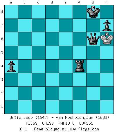 Last move : 0-1 2021 July 21 15:35:59 [Event "FICGS__CHESS__RAPID_C__000261"] [Site "FICGS"] [Date "2021.04.02"] [Round "1"] [White "Ortiz,Jose"] [Black "Van Mechelen,Jan"] [Result "0-1"] [WhiteElo "1647"] [BlackElo "1689"] 1.e4 e5 2.Nf3 Nc6 3.c3 Nf6 4.d3 a5 5.Bd2 Bc5 6.h3 d6 7.a3 a4 8.Be2 O-O 9.b4 axb3 10.c4 Nd4 11.Nxd4 Bxd4 12.Nc3 Nd7 13.O-O Nc5 14.Qb1 Be6 15.Qb2 c6 16.Kh1 b5 17.f4 f6 18.f5 Bf7 19.cxb5 cxb5 20.a4 bxa4 21.Ra3 Qd7 22.g4 d5 23.Kh2 dxe4 24.dxe4 Nxe4 25.Be1 Rfc8 26.Rf3 Rab8 27.Bd3 Nxc3 28.Bxc3 Bxc3 29.Qe2 e4 30.Bxe4 Qd6+ 31.Kg2 Qxa3 32.Bb1 Be5 33.h4 Bd5 34.Be4 Bxe4 35.Qxe4 Rc2+ 36.Rf2 Rxf2+ 37.Kxf2 Qa2+ 38.Ke3 b2 39.g5 b1Q 40.gxf6 Qxe4+ 41.Kxe4 Rb4+ 42.Kxe5 gxf6+ 43.Kxf6 Rxh4 44.Ke7 Qf7+ 45.Kd6 Rd4+ 46.Ke5 Qd5+ 47.Kf6 Rf4 48.Kg5 Qxf5+ 49.Kh6 Qg6+ 0-1 Ponziani : Jaenisch counter-attack Kingside Castling by player Black (move 8) Kingside Castling by player White (move 13) Promotion Queen by player Black (move 39) 10 pieces endgame at move 42 : White KPPP , Black KQRPPP WHITE : King + 3 Pawns BLACK : King + 1 Queen 1 Rook 3 Pawns 9 pieces endgame at move 42 : White KPP , Black KQRPPP WHITE : King + 2 Pawns BLACK : King + 1 Queen 1 Rook 3 Pawns 8 pieces endgame at move 43 : White KPP , Black KQRPP WHITE : King + 2 Pawns BLACK : King + 1 Queen 1 Rook 2 Pawns 7 pieces endgame at move 43 : White KP , Black KQRPP WHITE : King + 1 Pawn BLACK : King + 1 Queen 1 Rook 2 Pawns 6 pieces endgame at move 48 : White K , Black KQRPP WHITE : King + BLACK : King + 1 Queen 1 Rook 2 Pawns Player Black won this chess game. Follow this game move after move (download)Chess opens and enriches your mind. (Saudin Robovic) Ohne Fehler kann es keine Brillanz geben. (Emanuel Lasker) Bobby es el jugador de Ajedrez mas fino que este país jamás haya producido. Su memoria para las movidas, su brillantez en soñar combinaciones y su feróz determinación por la victoria son algo extraño. (John Collins) Des combinaisons [dans le jeu d'échecs] pareilles à des mélodies. Je crois entendre pour ainsi dire la musique des coups... (Vladimir Nabokov) Always be a first-rate version of yourself, instead of a second-rate version of somebody else. (Judy Garland)