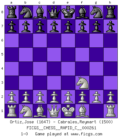 Last move : 1-0 2021 May 8 16:26:29 [Event "FICGS__CHESS__RAPID_C__000261"] [Site "FICGS"] [Date "2021.04.02"] [Round "1"] [White "Ortiz,Jose"] [Black "Cabrales,Reymart"] [Result "1-0"] [WhiteElo "1647"] [BlackElo "1500"] 1.Nf3 1-0 This chess game has been lost on time (started : 2021.04.02 22:44:9) Reti Opening Player White won this chess game. Follow this game move after move (download)Fischer sacrificed virtually everything most of us weakies (to use his term) value, respect, and cherish, for the sake of an artful, often beautiful board game, for the ambivalent privilege of being its greatest master. (Paul Kollar) Wie gewinnt Tal? Er entwickelt alle seine Figuren in die Brettmitte und opfert sie dann irgendwo. (Robert James Fischer) Tu sabes, camarada Pachman, no disfruto el ser un Ministro, preferería jugar al Ajedrez como tu. (Che Guevara) Avec des compensations pour le matériel en plus... (Anonyme) A person who never made a mistake never tried anything new. (Albert Einstein)