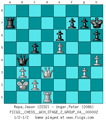 Last move : 1/2-1/2 2007 August 8 22:6:58 [Event "FICGS__CHESS__WCH_STAGE_2_GROUP_04__000002"] [Site "FICGS"] [Date "2007.07.11"] [Round "1"] [White "Repa,Jason"] [Black "Unger,Peter"] [Result "1/2-1/2"] [WhiteElo "2232"] [BlackElo "2086"] 1.e4 e6 2.d4 d5 3.Nc3 Nf6 4.Bg5 dxe4 5.Nxe4 Be7 6.Bxf6 Bxf6 7.Nf3 Nd7 8.Qd2 O-O 9.O-O-O Be7 10.Bd3 b6 11.h4 Bb7 12.Qe2 Nf6 13.Neg5 h6 14.Ne5 Bd6 15.Kb1 Qe7 16.f4 c5 17.dxc5 bxc5 18.Ne4 Nxe4 19.Bxe4 Rab8 20.b3 Bxe5 21.fxe5 Rfd8 22.Bxb7 Rxb7 23.g3 Rbd7 24.Rhe1 a5 25.Kc1 a4 26.Rxd7 Rxd7 27.Rd1 axb3 28.axb3 Ra7 29.Qd3 Qb7 30.Qd8+ Kh7 31.Qd3+ Kg8 32.Kb2 Qb4 33.Qd8+ Kh7 34.Qd3+ 1/2-1/2 French : Burn variation Kingside Castling by player Black (move 8) Queenside Castling by player White (move 9) This chess game ended in a draw. Follow this game move after move (download)As one by one I mowed them down, my superiority soon became apparent. (Jose Capablanca) Es gibt Leute, die glauben, alles wäre vernünftig, was man mit einem ernsthaften Gesicht tut. (Georg Christoph Lichtenberg) Ser exitoso en el Ajedrez te permite descubrir tu propia personalidad. Eso es lo que deseo para los niños de mi clase. (Saudin Robovic) On n'a jamais que l'âge auquel on a commence à jouer aux échecs car après on cesse de vieillir. (Capablanca) Real knowledge is to know the extent of one's ignorance. (Confucius)