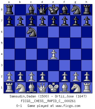 Last move : 0-1 2021 May 9 6:39:4 [Event "FICGS__CHESS__RAPID_C__000261"] [Site "FICGS"] [Date "2021.04.02"] [Round "1"] [White "Samsudin,Dadan"] [Black "Ortiz,Jose"] [Result "0-1"] [WhiteElo "1500"] [BlackElo "1647"] 1.e4 Nc6 0-1 This chess game has been lost on time (started : 2021.04.02 22:44:9) KP : Nimzovich defense Player Black won this chess game. Follow this game move after move (download)After a bad opening, there is hope for the middle game. After a bad middle game, there is hope for the endgame. But once you are in the endgame, the moment of truth has arrived. (Edmar Mednis) Die westlichen Werte sind eine Sprache, welche die Putin-Administration nicht versteht. (Garry Kasparov) En el Ajedrez, tal como en la vida, las bendiciones de hoy pueden ser el veneno del mañana. (Assaic) La conception d'un plan est le processus par lequel un joueur exploite les avantages de sa position tout en s'efforçant d'en réduire au minimum les inconvénients. Afin de garantir le succès, un plan doit toujours se fonder sur un diagnostic objectif des particularités d'une position. La conception d'un plan est d'autant plus difficile que la position est équilibrée, et grandement facilitée lorsqu'il n'existe qu'un seul plan susceptible de répondre aux exigences de la position. (Harry Golombek) They misunderestimated me. (George W. Bush, Bentonville nov. 6, 2000)