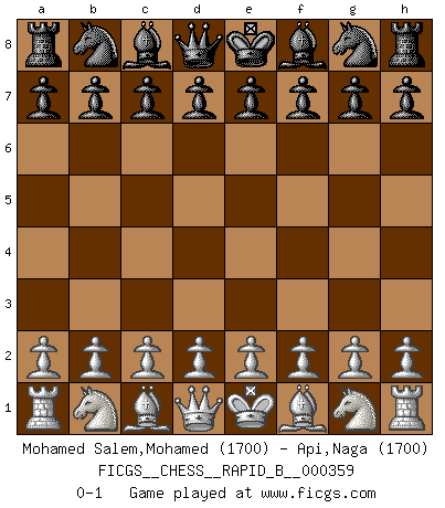 Last move : 0-1 2021 May 5 22:1:57 [Event "FICGS__CHESS__RAPID_B__000359"] [Site "FICGS"] [Date "2021.04.05"] [Round "1"] [White "Mohamed Salem,Mohamed"] [Black "Api,Naga"] [Result "0-1"] [WhiteElo "1700"] [BlackElo "1700"] 0-1 This chess game has been lost on time (started : 2021.04.05 10:51:6) Player Black won this chess game. Follow this game move after move (download)Strategy requires thought, tactics require observation. (Max Euwe) Irgendwie scheint mir sonntags früh um 9 Uhr der Killerinstinkt verloren gegangen zu sein. (Alexej Shirov) Un Peón pasado aumenta su poder a medida de que el número de piezas en el tablero disminuye. (Capablanca) Tout change constamment, y compris dans le monde des Echecs. (Botvinnik) The general who wins the battle makes many calculations in his temple before the battle is fought. The general who loses makes but few calculations beforehand. (Sun Tzu)