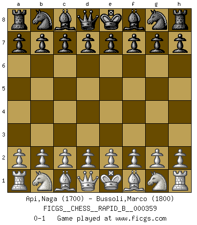 Last move : 0-1 2021 May 5 22:1:57 [Event "FICGS__CHESS__RAPID_B__000359"] [Site "FICGS"] [Date "2021.04.05"] [Round "1"] [White "Api,Naga"] [Black "Bussoli,Marco"] [Result "0-1"] [WhiteElo "1700"] [BlackElo "1800"] 0-1 This chess game has been lost on time (started : 2021.04.05 10:51:6) Player Black won this chess game. Follow this game move after move (download)Many have become Chess Masters, no one has become the Master of Chess. (Siegbert Tarrasch) Ohne Leiden bildet sich kein Charakter. (Ernst Freiherr von Feuchtersleben) Aquel que toma al Peón de Caballo de la Reina, se pasará la noche a dormir en la calle. (Anónimo) Aux échecs, les retours au sommet sont rares : les dommages psychologiques consécutifs à une défaite sont trop sévères. (Daily Telegraph) Internal peace cannot coexist with external war. (Don Groves)