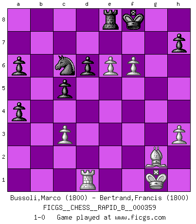 Last move : 1-0 2021 May 5 20:52:29 [Event "FICGS__CHESS__RAPID_B__000359"] [Site "FICGS"] [Date "2021.04.05"] [Round "1"] [White "Bussoli,Marco"] [Black "Bertrand,Francis"] [Result "1-0"] [WhiteElo "1800"] [BlackElo "1800"] 1.d4 Nf6 2.c4 c5 3.d5 e6 4.Nc3 exd5 5.cxd5 d6 6.e4 g6 7.f4 Bg7 8.Bb5+ Nfd7 9.a4 O-O 10.Nf3 Na6 11.O-O Nb4 12.Re1 a6 13.Bf1 Re8 14.Bd2 f5 15.h3 fxe4 16.Nxe4 Nf6 17.Nxf6+ Bxf6 18.Qb3 Rxe1 19.Rxe1 Bf5 20.g4 Bd7 21.Ng5 Qa5 22.Ra1 b5 23.Qg3 bxa4 24.f5 Qc7 25.Rd1 Re8 26.Ne6 Bxe6 27.dxe6 gxf5 28.Bc3 Bxc3 29.bxc3 Nc6 30.gxf5 Qg7 31.Qg2 Kf8 32.f6 Qxg2+ 33.Bxg2 1-0 Benoni : pawn storm variation Kingside Castling by player Black (move 9) Kingside Castling by player White (move 11) Player White won this chess game. Follow this game move after move (download)Chess is ruthless: you've got to be prepared to kill people. (Nigel Short) Sitze auf Deine Hände. (Siegbert Tarrasch) El Ajedrez es en su esencia, un juego. En su forma, un arte. Y en su ejecución, una ciencia. (Baron Tassilo) Comme les marins qui ont mille raisons différentes d'aller en mer, les joueurs d'échecs en ont tout autant avant de s'installer devant une table et jouer... (Vincent Bertignac, philosophe) He who fights with monsters should be careful lest he thereby become a monster. (Friedrich Nietzsche, Beyond Good and Evil)