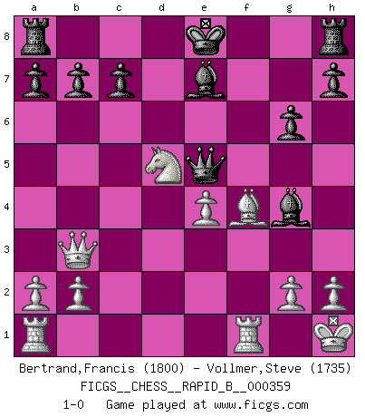 Last move : 1-0 2021 May 23 11:27:5 [Event "FICGS__CHESS__RAPID_B__000359"] [Site "FICGS"] [Date "2021.04.05"] [Round "1"] [White "Bertrand,Francis"] [Black "Vollmer,Steve"] [Result "1-0"] [WhiteElo "1800"] [BlackElo "1735"] 1.e4 e5 2.Nf3 Nc6 3.d4 exd4 4.Bc4 Be7 5.c3 d6 6.Qb3 Ne5 7.Nxe5 dxe5 8.Bxf7+ Kf8 9.O-O Nf6 10.f4 Qd6 11.Kh1 Bd7 12.cxd4 Qxd4 13.Nc3 Ng4 14.Bh5 g6 15.Bxg4 Bxg4 16.fxe5 Ke8 17.Nd5 Qxe5 18.Bf4 1-0 Scotch gambit : Benima defense Kingside Castling by player White (move 9) Player White won this chess game. Follow this game move after move (download)All that matters on the Chessboard is good moves. (Bobby Fischer) Im Blitz ist es einfacher mit einer Figur weniger anzugreifen, als sich mit einer Mehrfigur zu verteidigen. (Mikhail Nekhemyevich Tal) La caracteristica mas importante en la posición del Ajedrez es la actividad de las piezas. Esto es absolutamente fundamental en todas las fases del juego: Apertura, Juego Medio y especialmente Finales. La limitación primordial en la actividad de una pieza, es la estructuración de los Peones. (Michael Stean) Horreur, mais aussi harmonie suprême : qu'y avait-il en effet au monde en dehors des échecs ? Le brouillard, l'inconnu, le non-être... (Vladimir Nabokov) The human is the only animal species whose members are able to talk themselves into difficulties that would not otherwise exist. (Wendell Johnson)