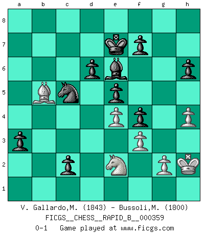 Last move : 0-1 2021 July 10 19:22:20 [Event "FICGS__CHESS__RAPID_B__000359"] [Site "FICGS"] [Date "2021.04.05"] [Round "1"] [White "V. Gallardo,Miguel"] [Black "Bussoli,Marco"] [Result "0-1"] [WhiteElo "1843"] [BlackElo "1800"] 1.e4 c5 2.Nf3 e6 3.d4 cxd4 4.Qxd4 Nc6 5.Qd1 Nf6 6.Nc3 Bb4 7.Bd3 Bxc3+ 8.bxc3 e5 9.Bg5 d6 10.O-O h6 11.Bh4 Be6 12.Re1 g5 13.Bg3 Rc8 14.a3 Na5 15.h3 Rxc3 16.Bb5+ Ke7 17.Qd2 Qc7 18.a4 Rxc2 19.Qb4 Qc3 20.Qxc3 Rxc3 21.Nd2 Nh5 22.Bh2 Rhc8 23.Be2 Nf4 24.Bxf4 gxf4 25.Kh2 Rc2 26.Nf3 Nb3 27.Rab1 R8c3 28.Ng1 Nc5 29.a5 Ra3 30.Ra1 Rca2 31.Rxa2 Rxa2 32.f3 Rxa5 33.Bf1 b5 34.Rc1 b4 35.Be2 Ra2 36.h4 a5 37.Bb5 b3 38.Ne2 a4 39.Nc3 Rc2 40.Rxc2 bxc2 41.Ne2 a3 0-1 This chess game has been lost on time (started : 2021.04.05 10:51:6) Sicilian defense Kingside Castling by player White (move 10) Player Black won this chess game. Follow this game move after move (download)My style is somewhere between that of Tal and Petrosian. (Reshevsky) Charakterschwächen offenbaren sich normalerweise während einer Schachpartie. (Garry Kasparov) Me siento como si fuera una pieza en una partida de Ajedrez, cuando mi oponente me indica: esa pieza no puede ser movida. (Soren Kierkegaard) Mon pion favori sur ma case favorite ! Bronstein en parlant d'un coup de pion en h5 quand il avait les Noirs. The Internet is so big, so powerful and pointless that for some people it is a complete substitute for life. (Andrew Brown)