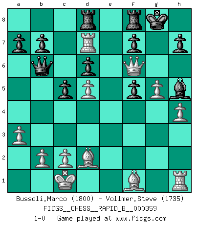 Last move : 1-0 2021 May 8 10:59:52 [Event "FICGS__CHESS__RAPID_B__000359"] [Site "FICGS"] [Date "2021.04.05"] [Round "1"] [White "Bussoli,Marco"] [Black "Vollmer,Steve"] [Result "1-0"] [WhiteElo "1800"] [BlackElo "1735"] 1.e4 e5 2.Nf3 Nc6 3.d4 exd4 4.Nxd4 Nxd4 5.Qxd4 d6 6.Nc3 Nf6 7.f3 Be7 8.Be3 c6 9.O-O-O O-O 10.g4 Be6 11.g5 Ne8 12.h4 Qa5 13.a3 Nc7 14.Bd2 Qb6 15.Qd3 c5 16.f4 Bg4 17.Re1 Rad8 18.f5 Bh5 19.f6 gxf6 20.Qg3 Kh8 21.Nd5 Nxd5 22.exd5 Rde8 23.Rxe7 f5 24.Rd7 Rd8 25.Qc3+ Kg8 26.Qf6 1-0 Scotch game Queenside Castling by player White (move 9) Kingside Castling by player Black (move 9) Player White won this chess game. Follow this game move after move (download)I look one move ahead... the best ! (Siegbert Tarrasch) Lisa Lane, amerikanische Schachmeisterin, hatte Fischer einmal als stärksten lebenden Spieler bezeichnet. Antwort: Das ist richtig, aber Lisa Lane ist eigentlich nicht in der Lage, das zu beurteilen. (Robert James Fischer) El Rey es una pieza de pelea. ¡Usenlo!. (Wilhelm Steinitz) Aidez vos pièces, elles vous aideront. (Paul Morphy) The only sure thing about luck is that it will change. (Wilson Mizner)
