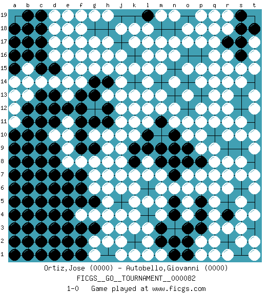 Last move : 1-0 2022 July 15 6:46:25 [Event "FICGS__GO__TOURNAMENT__000082"] [Site "FICGS"] [Date "2021.04.07"] [Round "1"] [Black "Ortiz,Jose"] [White "Autobello,Giovanni"] [Result "1-0"] [Rating 1 "0000"] [Rating 2 "0000"] 1.k11 r11 2.k12 r10 3.p11 r12 4.q13 q12 5.p13 p12 6.o12 o13 7.k13 o11 8.n10 n12 9.n13 n14 10.m14 m13 11.l14 p14 12.n15 p10 13.q10 q11 14.m11 q9 15.r9 r8 16.s9 r13 17.q14 o15 18.q16 q15 19.r14 t9 20.t8 t10 21.p16 n16 22.o9 s8 23.s7 s10 24.p8 m15 25.k14 r15 26.l13 r16 27.o16 s14 28.l16 t7 29.s6 q17 30.p17 p18 31.n18 o17 32.m18 p15 33.k16 r7 34.q7 r6 35.q6 t6 36.r5 s5 37.r4 q5 38.p5 q4 39.p4 q3 40.q2 r3 41.r2 s4 42.p3 p2 43.o2 p1 44.n2 s2 45.s1 r1 46.o1 t1 47.n1 q1 48.o3 p6 49.o6 o7 50.n7 n6 51.n5 o5 52.n4 p7 53.n8 m17 54.k17 l18 55.l19 m19 56.k19 k18 57.j19 j18 58.h18 h17 59.g18 l12 60.j17 h16 61.g16 g17 62.f17 f16 63.e16 g15 64.j15 f18 65.e17 g19 66.e19 h19 67.c19 o18 68.e18 n19 69.f19 n17 70.k15 e15 71.c15 d14 72.d15 d16 73.c16 d17 74.c17 d18 75.b18 q8 76.o8 c14 77.c18 d19 78.e19 e18 79.b16 b15 80.a15 b14 81.a16 a14 82.b17 f14 83.f13 f19 84.d13 e13 85.e12 e14 86.d12 f12 87.g13 j12 88.h12 j11 89.h11 j10 90.f11 g12 91.g11 l11 92.l10 k10 93.l9 m7 94.m8 l8 95.k8 l7 96.l6 h13 97.h14 j14 98.g14 k6 99.l5 m5 100.l4 m4 101.m3 m6 102.k9 k7 103.j6 k5 104.h6 j8 105.h8 j9 106.j7 l3 107.k3 l2 108.l1 k4 109.k2 k1 110.j2 m1 111.m2 j3 112.h4 j4 113.j5 h2 114.f3 j1 115.e3 g4 116.f5 h3 117.g3 h5 118.g5 f4 119.e4 h4 120.d4 h15 121.c4 g6 122.f6 g7 123.e7 g8 124.f12 h9 125.f10 h7 126.f7 f8 127.f9 e8 128.d8 e9 129.d9 e10 130.c9 d10 131.c10 c11 132.d11 c12 133.c13 b13 134.a13 a12 135.a10 a11 136.a9 b10 137.b9 j13 138.g9 h10 139.f2 g1 140.f1 e5 141.d5 n11 142.d6 c7 143.b6 j16 144.a6 l15 145.m16 l17 146.k16 k15 147.c8 k17 148.c6 l16 149.b7 g10 150.d7 e11 151.c5 g2 152.b11 o4 153.f17 e17 154.e2 k13 155.k2 j2 156.e1 k3 157.b12 p9 158.n9 o10 159.m9 t15 160.s16 t16 161.s17 t17 162.s18 r18 163.s19 r19 164.t18 a13 165.a17 s15 166.r17 q16 167.q18 q19 168.c3 o6 169.s12 t12 170.s13 t13 171.q14 s11 172.t3 r14 173.j7 j6 174.b3 q13 175.c2 t4 176.s3 q18 177.d3 t2 178.d2 m12 179.b5 l14 180.c7 e19 181.a18 h6 182.b19 e16 183.c11 s3 184.b4 f15 185.b8 k11 186.b2 l1 187.a5 k12 188.a7 q7 189.e6 q2 190.b10 p19 191.e5 j15 192.c12 p17 193.a8 q14 194.d1 q6 195.c1 h8 196.a4 f17 197.a2 l13 198.a3 m16 199.a1 g16 200.b1 p11 201.s6 s7 202.r4 j7 203.l6 l5 204.l19 1-0 This go game has been lost on time (started : 2021.04.07 1:13:25) Here are the names of the openings (joseki) played in the four corners : Corner q16 : r11 p11 This joseki is unknown. A weak or weird move has probably been played in this corner. Corner q4 : q9 r9 This joseki is unknown. A weak or weird move has probably been played in this corner. Corner d16 : j19 j18 This joseki is unknown. A weak or weird move has probably been played in this corner. Player Black won this Go (weiqi, baduk) game. Follow this game move after move (download)There are players who don't accept exchange: they play many moves that perpetuate a previous state of the game. (Pierre Audouard) Excelling at chess has long been considered a symbol of more general intelligence. That is an incorrect assumption in my view, as pleasant as it might be. But for the purposes of argument and investigation, chess is, in Russkin-Gutman's words, 'an unparalleled laboratory, since both the learning process and the degree of ability obtained can be objectified and quantified, providing an excellent comparative framework on which to use rigorous analytical techniques.' (The Chess Master and the Computer, by Garry Kasparov - 2010)