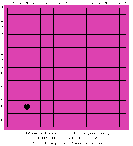 Last move : 1-0 2021 May 7 13:28:38 [Event "FICGS__GO__TOURNAMENT__000082"] [Site "FICGS"] [Date "2021.04.07"] [Round "1"] [Black "Autobello,Giovanni"] [White "Lin,Wei Lun"] [Result "1-0"] [Rating 1 "0000"] 1.d4 1-0 This go game has been lost on time (started : 2021.04.07 1:13:25) Here are the names of the openings (joseki) played in the four corners : Corner d4 : d4 1-0 Hoshi (Hwajeom, Seongjeom, Xingwei`) 4-4 Point. The star or hoshi (4-4) point, emphasizing influence at the potential expense of territory. Player Black won this Go (weiqi, baduk) game. Follow this game move after move (download)Keep sente in the opening. A premature attack loses sente. (Anonymous) I take risks, sometimes patients die, but not taking risks causes more patients to die. So I guess my biggest problem is I've been cursed with the ability to do the math. (Gregory House, House M.D.)