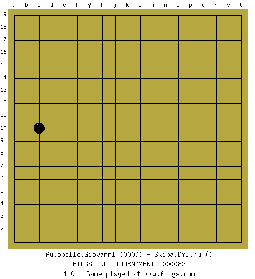 Last move : 1-0 2021 May 7 13:28:38 [Event "FICGS__GO__TOURNAMENT__000082"] [Site "FICGS"] [Date "2021.04.07"] [Round "1"] [Black "Autobello,Giovanni"] [White "Skiba,Dmitry"] [Result "1-0"] [Rating 1 "0000"] 1.c10 1-0 This go game has been lost on time (started : 2021.04.07 1:13:25) Here are the names of the openings (joseki) played in the four corners : Player Black won this Go (weiqi, baduk) game. Follow this game move after move (download)Never try to cut bamboo joints. (Anonymous) This is where the fun begins. (Anakin Skywalker in Star Wars ep.3)
