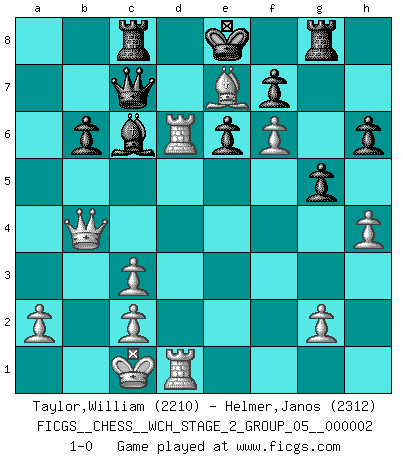 Last move : 1-0 2007 November 11 17:52:3 [Event "FICGS__CHESS__WCH_STAGE_2_GROUP_05__000002"] [Site "FICGS"] [Date "2007.07.11"] [Round "1"] [White "Taylor,William"] [Black "Helmer,Janos"] [Result "1-0"] [WhiteElo "2210"] [BlackElo "2312"] 1.e4 c5 2.Nf3 Nc6 3.d4 cxd4 4.Nxd4 Nf6 5.Nc3 d6 6.Bg5 Bd7 7.Qd2 Rc8 8.f4 Nxd4 9.Qxd4 Qa5 10.e5 dxe5 11.fxe5 e6 12.O-O-O Bc6 13.Bb5 Bxb5 14.exf6 Bc6 15.h4 g6 16.Rhe1 h6 17.Qc4 Bd7 18.Qd3 Qc7 19.Be3 Bb4 20.Bxa7 Bxc3 21.bxc3 Bc6 22.Bc5 b6 23.Be7 Bd5 24.Qb5+ Bc6 25.Qb4 g5 26.Rd6 Rg8 27.Red1 1-0 Sicilian defense Queenside Castling by player White (move 12) Player White won this chess game. Follow this game move after move (download)That's what Chess is all about. One day you give your opponent a lesson, the next day he gives you one. (Bobby Fischer) Ich hatte Zahnschmerzen im ersten Spiel. In der zweiten Partie tat mir der Kopf weh. In der dritten war es eine Rheuma-Attacke und während der vierten fühlte ich mich nicht gut. Und in der fünften? Nun, man muss doch nicht jedes Spiel gewinnen, oder? (Savielly Grigorievitsch Tartakower) El Ajedrez es un cuento de Hadas de las 1001 metidas de pata. (Savielly Tartakower) Nous vivons dans un monde échiquéen : chaque jour qui passe est un défi à relever. (Philosophe Sasha) Creativity is allowing yourself to make mistakes. Art is knowing which ones to keep. (Scott Adams)