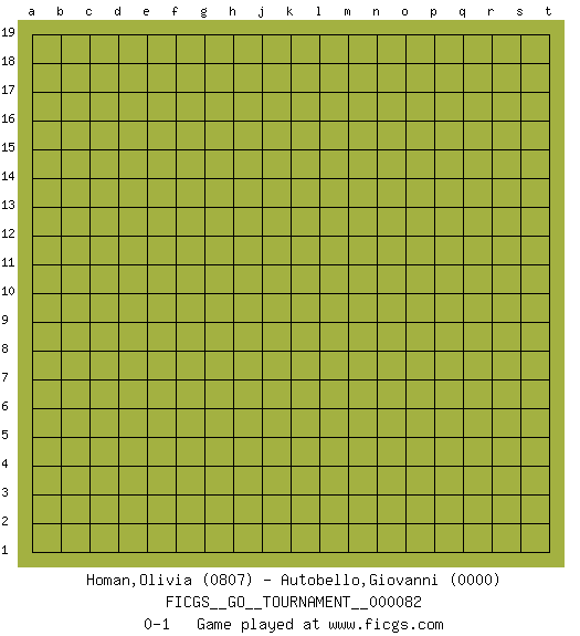 Last move : 0-1 2021 May 7 13:28:38 [Event "FICGS__GO__TOURNAMENT__000082"] [Site "FICGS"] [Date "2021.04.07"] [Round "1"] [Black "Homan,Olivia"] [White "Autobello,Giovanni"] [Result "0-1"] [Rating 1 "0807"] [Rating 2 "0000"] 0-1 This go game has been lost on time (started : 2021.04.07 1:13:25) Here are the names of the openings (joseki) played in the four corners : Player White won this Go (weiqi, baduk) game. Follow this game move after move (download)Dead group ? Always win ko fights ! (Anonymous) A belief is an idea the mind possesses, an idea that possesses the mind. (Robert Oxden Bolton)
