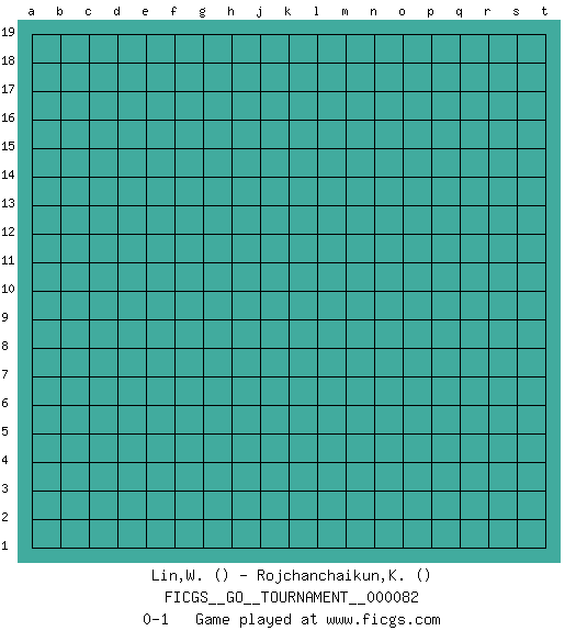 Last move : 0-1 2021 May 7 13:28:38 [Event "FICGS__GO__TOURNAMENT__000082"] [Site "FICGS"] [Date "2021.04.07"] [Round "1"] [Black "Lin,Wei Lun"] [White "Rojchanchaikun,Kasamepong"] [Result "0-1"] 0-1 This go game has been lost on time (started : 2021.04.07 1:13:25) Here are the names of the openings (joseki) played in the four corners : Player White won this Go (weiqi, baduk) game. Follow this game move after move (download)Territory is a closed space where time no longer exists. The transformation around it slower alter it, and sometimes it cracks open like a rotten egg at the least shock. (Pierre Audouard) O divine art of subtlety and secrecy! Through you we learn to be invisible, through you inaudible and hence we can hold the enemy's fate in our hands. (Sun Tzu)