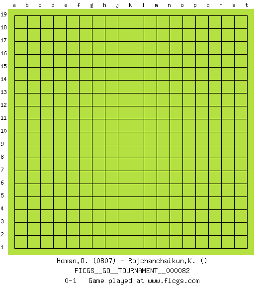 Last move : 0-1 2021 May 7 13:28:38 [Event "FICGS__GO__TOURNAMENT__000082"] [Site "FICGS"] [Date "2021.04.07"] [Round "1"] [Black "Homan,Olivia"] [White "Rojchanchaikun,Kasamepong"] [Result "0-1"] [Rating 1 "0807"] 0-1 This go game has been lost on time (started : 2021.04.07 1:13:25) Here are the names of the openings (joseki) played in the four corners : Player White won this Go (weiqi, baduk) game. Follow this game move after move (download)On the second line six die, eight live. (Anonymous) Life is pleasant. Death is peaceful. It's the transition that's troublesome. (Isaac Asimov)