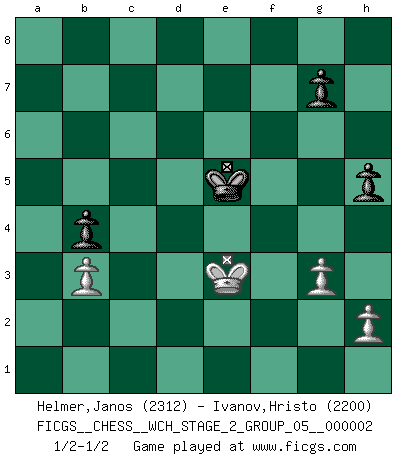 Last move : 1/2-1/2 2007 December 6 23:25:13 [Event "FICGS__CHESS__WCH_STAGE_2_GROUP_05__000002"] [Site "FICGS"] [Date "2007.07.11"] [Round "1"] [White "Helmer,Janos"] [Black "Ivanov,Hristo"] [Result "1/2-1/2"] [WhiteElo "2312"] [BlackElo "2200"] 1.Nf3 Nf6 2.c4 c5 3.Nc3 Nc6 4.d4 cxd4 5.Nxd4 e6 6.Ndb5 d5 7.cxd5 Nxd5 8.Nxd5 exd5 9.Qxd5 Bb4+ 10.Bd2 Qe7 11.O-O-O Bxd2+ 12.Rxd2 O-O 13.Qd6 Qh4 14.g3 Qe4 15.f3 Qe3 16.Qa3 Qb6 17.e4 Be6 18.Be2 Rad8 19.Rhd1 Rxd2 20.Rxd2 a5 21.b3 Qg1+ 22.Bd1 Qe3 23.Qb2 Qc5+ 24.Nc3 a4 25.Kb1 axb3 26.axb3 f5 27.Nd5 fxe4 28.fxe4 Rf1 29.Qc2 Qa3 30.Qa2 Qf8 31.Qa4 h6 32.Nf4 Qe7 33.Nxe6 Qxe6 34.Ka2 Qf6 35.Qc4+ Kh7 36.Qc5 Ne5 37.Qc3 b5 38.Rd5 b4 39.Qd4 Qa6+ 40.Kb1 Qa3 41.Qb2 Ng4 42.Rd7 Qxb2+ 43.Kxb2 Ne3 44.Kc1 Rh1 45.e5 Kg6 46.Rd3 Nxd1 47.Rxd1 Rxd1+ 48.Kxd1 Kf5 49.Ke2 Kxe5 50.Ke3 h5 1/2-1/2 Reti Opening Queenside Castling by player White (move 11) Kingside Castling by player Black (move 12) 10 pieces endgame at move 47 : White KPPPP , Black KRPPP WHITE : King + 4 Pawns BLACK : King + 1 Rook 3 Pawns 9 pieces endgame at move 48 : White KPPPP , Black KPPP WHITE : King + 4 Pawns BLACK : King + 3 Pawns 8 pieces endgame at move 49 : White KPPP , Black KPPP WHITE : King + 3 Pawns BLACK : King + 3 Pawns This chess game ended in a draw. Follow this game move after move (download)Chess mastery essentially consists of analyzing Chess positions accurately. (Mikhail Botvinnik) Obwohl ich alt bin, darf mir niemand den Finger in den Mund stecken, sonst beisse ich. (Wilhelm Steinitz) El estómago es una parte esencial del maestro de Ajedrez. (Bent Larsen) Tous ces prétendus hommes politiques sont les pions, les Cavaliers, les Tours ou les Fous d'une partie d'échecs qui se jouera tant qu'un hasard ne renversera pas l'échiquier. (Honoré de Balzac) Hold em is to stud what chess is to checkers. (Johnny Moss)