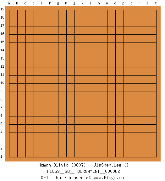 Last move : 0-1 2021 May 7 13:28:38 [Event "FICGS__GO__TOURNAMENT__000082"] [Site "FICGS"] [Date "2021.04.07"] [Round "1"] [Black "Homan,Olivia"] [White "JiaShen,Lee"] [Result "0-1"] [Rating 1 "0807"] 0-1 This go game has been lost on time (started : 2021.04.07 1:13:25) Here are the names of the openings (joseki) played in the four corners : Player White won this Go (weiqi, baduk) game. Follow this game move after move (download)Learn to play under the stones. (Anonymous) Only sick music makes money today. (Friedrich Nietzsche)