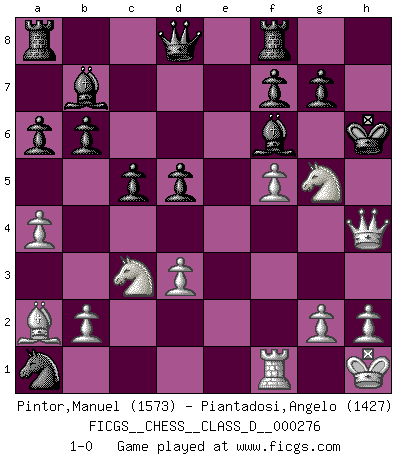 Last move : 1-0 2021 May 7 16:10:54 [Event "FICGS__CHESS__CLASS_D__000276"] [Site "FICGS"] [Date "2021.04.07"] [Round "1"] [White "Pintor,Manuel"] [Black "Piantadosi,Angelo"] [Result "1-0"] [WhiteElo "1573"] [BlackElo "1427"] 1.e4 c5 2.f4 d6 3.Nf3 Nc6 4.Bc4 e6 5.O-O Nf6 6.Nc3 Be7 7.d3 O-O 8.Kh1 a6 9.a4 b6 10.Ng5 d5 11.exd5 exd5 12.Ba2 h6 13.Nh3 Bb7 14.Qe1 Nd4 15.Qf2 Ng4 16.Qg3 Nxc2 17.Qxg4 Nxa1 18.f5 Bf6 19.Bxh6 Kh7 20.Ng5+ Kxh6 21.Qh4+ 1-0 Sicilian : Grand Prix attack Kingside Castling by player White (move 5) Kingside Castling by player Black (move 7) Player White won this chess game. Follow this game move after move (download)I have never in my life played the French Defence, which is the dullest of all openings. (Wilhelm Steinitz) Nicht daß Diemer aus Opportunismus Mitglied der NSDAP geworden wäre. Er war ein Fanatiker, in allem, was er tat. (Hans Ree) Los Peones son nacidos libres, y aún así, se encuentran por doquier encadenados. (Rick Kennedy) La tactique, c'est ce que vous faites quand il y a quelque chose à faire; la stratégie, c'est ce que vous faites quand il n'y a rien à faire. (Savielli Tartacower) A shortcut is the longest distance between two points. (Don Groves)
