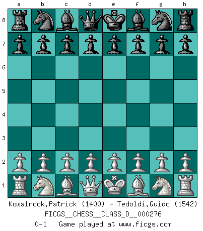 Last move : 0-1 2021 May 17 17:45:14 [Event "FICGS__CHESS__CLASS_D__000276"] [Site "FICGS"] [Date "2021.04.07"] [Round "1"] [White "Kowalrock,Patrick"] [Black "Tedoldi,Guido"] [Result "0-1"] [WhiteElo "1400"] [BlackElo "1542"] 0-1 This chess game has been lost on time (started : 2021.04.07 7:52:33) Player Black won this chess game. Follow this game move after move (download)A thorough understanding of the typical mating continuations makes the most complicated sacrificial combinations leading up to them not only not difficult, but almost a matter of course. (Siegbert Tarrasch) Karpov ist ein Museumsstück. (Garry Kasparov) El hombre es un frívolo, una creatura engañosa y como un jugador de Ajedrez, se preocupa mas por el proceso de obtener su meta que de la meta por sí misma. (Dostoyevsky) Les Echecs, c'est l'art de la guerre sans les charniers, c'est la résurrection des morts tombés au champ d'honneur, l'espoir perpétuel, la suprématie de l'intelligence sur la force, la culture de l'esprit. (F. Szpiner) True nature is revealed in times of difficulty. (Chinese proverb)