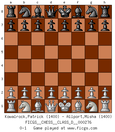 Last move : 0-1 2021 May 17 17:45:14 [Event "FICGS__CHESS__CLASS_D__000276"] [Site "FICGS"] [Date "2021.04.07"] [Round "1"] [White "Kowalrock,Patrick"] [Black "Allport,Misha"] [Result "0-1"] [WhiteElo "1400"] [BlackElo "1400"] 0-1 This chess game has been lost on time (started : 2021.04.07 7:52:33) Player Black won this chess game. Follow this game move after move (download)Chess opens and enriches your mind. (Saudin Robovic) Fischer: 'Remis!?' Uhlmann: 'Aber es muss doch dreimal Zugwiederholung sein!' Fischer: 'Sie nehmen das Remis an, wie ich es sage, sonst spiele ich weiter und werde Sie dann schlagen!' (Robert James Fischer) Uno por uno, yo los acribillé, mi superioridad muy pronto se volvio aparente. (Jose Capablanca) Mais l'homme est une créature légère et illogique : semblable au joueur d'échecs, il n'aime que le processus du but à atteindre, non le but lui-même. (Dostoïevsky) Two beer, or not two beer. (Unknown)