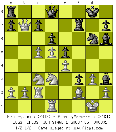 Last move : 1/2-1/2 2007 August 13 4:44:6 [Event "FICGS__CHESS__WCH_STAGE_2_GROUP_05__000002"] [Site "FICGS"] [Date "2007.07.11"] [Round "1"] [White "Helmer,Janos"] [Black "Plante,Marc-Eric"] [Result "1/2-1/2"] [WhiteElo "2312"] [BlackElo "2101"] 1.c4 Nf6 2.Nc3 g6 3.d4 Bg7 4.e4 d6 5.Be2 O-O 6.Nf3 e5 7.O-O Nc6 8.d5 Ne7 9.Ne1 Nd7 10.Be3 f5 11.f3 f4 12.Bf2 g5 13.Nd3 Nf6 14.c5 Ng6 15.Rc1 Rf7 16.Qb3 g4 17.fxg4 Nxg4 18.Bxg4 Bxg4 19.Qxb7 f3 20.g3 Bh6 21.Rc2 Bh3 22.Rd1 1/2-1/2 English Opening Kingside Castling by player Black (move 5) Kingside Castling by player White (move 7) This chess game ended in a draw. Follow this game move after move (download)The beauty of a move lies not in its' appearance but in the thought behind it. (Siegbert Tarrasch) Um dein Spiel zu verbessern musst du zuallererst das Endspiel studieren, denn diese kann unabhängig studiert werden. Die Eröffnung und das Mittelspiel müssen immer in Bezug gesetzt werden zum Endspiel. (José Raúl Capablanca) Ciertamente el estado mental actual de Bobby Fischer es una tragedia. Uno de los mas grandes jugadores de Ajedrez del mundo -el orgullo y pena del Ajedrez Americano. (Frank Brady) Dieu déplace le joueur, et celui-ci la pièce. Quel Dieu derrière Dieu commence donc la trame ? Arturo Perez-Reverte (prix de littérature policière 1993). Ah, beer! The cause of, and the solution to, all of life's problems. (Homer Simpson)