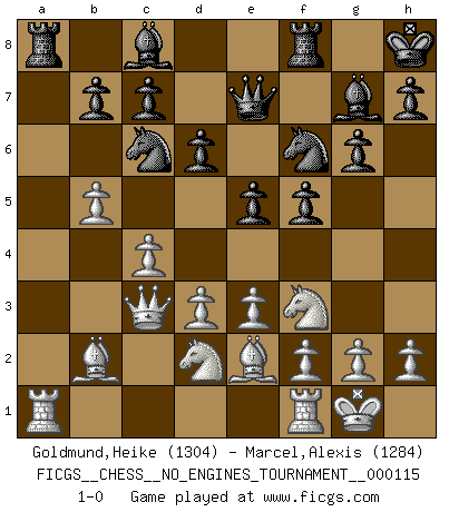 Last move : 1-0 2021 July 10 19:48:50 [Event "FICGS__CHESS__NO_ENGINES_TOURNAMENT__000115"] [Site "FICGS"] [Date "2021.04.09"] [Round "1"] [White "Goldmund,Heike"] [Black "Marcel,Alexis"] [Result "1-0"] [WhiteElo "1304"] [BlackElo "1284"] 1.b4 f5 2.Bb2 Nf6 3.e3 g6 4.Nf3 Bg7 5.c4 O-O 6.Qb3 e6 7.Be2 Kh8 8.O-O Nc6 9.d3 a6 10.Nbd2 d6 11.Qc3 e5 12.a4 Qe7 13.b5 axb5 14.axb5 1-0 Polish (Sokolsky) opening Kingside Castling by player Black (move 5) Kingside Castling by player White (move 8) Player White won this chess game. Follow this game move after move (download)You have to have the fighting spirit. You have to force moves and take chances. (Bobby Fischer) Wie kann ich Remis annehmen? Ich weiß ja gar nicht, wie ich stehe! (Fritz Sämisch) Yo creo que el Ajedrez posee una magia que es también una ayuda en la edad avanzada. Una rodilla reumática es olvidada durante una partida de Ajedrez y otros eventos pueden parecer algo sin importancia comparada a una catástrofe en el tablero de Ajedrez. (Vlastimil Hort) Les échecs c'est le défi de l'alpiniste, toujours plus haut, prêt à tout pour monter à l'assaut du Roi ennemi. Les échecs, c'est de la musique en mouvement, un ballet majestueux pour les yeux. C'est de la poésie composée par les fantômes du passé qui au même titre que Rimbaud ou Verlaine méritent notre admiration. Les échecs, c'est de la peinture ou le moindre mouvement modifie le tableau pour en faire un Picasso ou un Van Gogh. Les échecs, c'est tout et rien, c'est la vie et la mort. Jjulie33 sur le forum de France-Echecs. Hello Thibault, if I have had a plan (and I had one, I hope), I have forgotten it during the last week... - Hello Heinz-Georg. What do you mean a plan ? (Anonymous players, during a Big Chess game)