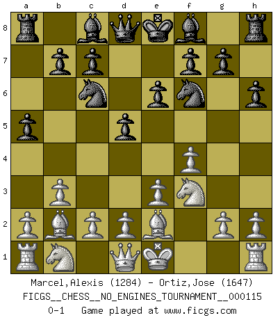 Last move : 0-1 2021 June 12 6:24:14 [Event "FICGS__CHESS__NO_ENGINES_TOURNAMENT__000115"] [Site "FICGS"] [Date "2021.04.09"] [Round "1"] [White "Marcel,Alexis"] [Black "Ortiz,Jose"] [Result "0-1"] [WhiteElo "1284"] [BlackElo "1647"] 1.f4 e6 2.Nf3 Nf6 3.e3 h6 4.b3 Nc6 5.Bb2 a5 6.Be2 d5 0-1 This chess game has been lost on time (started : 2021.04.09 16:55:30) Bird's Opening Player Black won this chess game. Follow this game move after move (download)Chess, like love, is infectious at any age. (Flohr) Früher wurde jeder komplizierte Zug, jedes interessante Opfer mit großem Beifall und Enthusiasmus aufgenommen. Heute schaltet man einfach seinen Fritz an, und man kann sehen, was los ist, ob der Zug geht oder nicht. (Vladimir Kramnik) Las leyes del Ajedrez no permiten una libre elección: tienes que mover quieras o no. (Emanuel Lasker) Vouloir jouer aux échecs contre soi-même est aussi paradoxal que vouloir marcher sur son ombre. (Stefan Zweig) To steal ideas from one person is plagiarism. To steal from many is research. (Unknown)