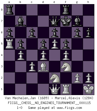 Last move : 1-0 2021 July 9 16:19:41 [Event "FICGS__CHESS__NO_ENGINES_TOURNAMENT__000115"] [Site "FICGS"] [Date "2021.04.09"] [Round "1"] [White "Van Mechelen,Jan"] [Black "Marcel,Alexis"] [Result "1-0"] [WhiteElo "1689"] [BlackElo "1284"] 1.e4 g6 2.d4 Bg7 3.Nc3 e6 4.Be3 Ne7 5.f4 O-O 6.Nf3 f5 7.e5 c6 8.Bd3 d5 9.Ne2 Nd7 10.O-O a6 11.c3 b6 12.Kh1 Bb7 13.Bf2 b5 14.Bh4 Qe8 15.a4 Nb6 16.a5 Nc4 17.Qc1 h6 18.b3 Nxa5 19.Rxa5 Qd7 20.Bxe7 Qxe7 21.b4 Kf7 22.Qe1 1-0 Robatsch defense Kingside Castling by player Black (move 5) Kingside Castling by player White (move 10) Player White won this chess game. Follow this game move after move (download)Even the laziest King flees wildly in the face of a double check ! (Aaron Nimzowitsch) Je älter ich werde, um so mehr schätze ich die Bauern. (Paul Keres) Botvinnik trataba de restarle el misterio al Ajedrez, siempre relacionandolo a situaciones de la vida ordinaria. El gustaba de llamar al Ajedrez un típico problema inexacto similar a aquellos de los cuales la gente siempre tiene que enfrentarse en la vida cotidiana. (Garry Kasparov) Les Echecs, c'est l'art de la guerre sans les charniers, c'est la résurrection des morts tombés au champ d'honneur, l'espoir perpétuel, la suprématie de l'intelligence sur la force, la culture de l'esprit. (F. Szpiner) A good player is always lucky. (Capablanca)