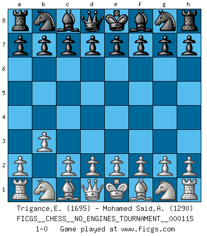 Last move : 1-0 2021 May 20 1:52:45 [Event "FICGS__CHESS__NO_ENGINES_TOURNAMENT__000115"] [Site "FICGS"] [Date "2021.04.09"] [Round "1"] [White "Trigance,Emile"] [Black "Mohamed Said,Azaim"] [Result "1-0"] [WhiteElo "1695"] [BlackElo "1290"] 1.b3 1-0 This chess game has been lost on time (started : 2021.04.09 16:55:30) Nimzovich-Larsen attack Player White won this chess game. Follow this game move after move (download)Chess, like love, is infectious at any age. (Flohr) Bis zum Jahr 1971 verlief in meiner Schachkariere alles glatt. Dieses dramatische Match [Fischer-Taimanov 6:0] machte mein Leben zur Hölle. (Mark Taimanov) El jugador blanco perdió porque fallo en recordar la coreccta continuación y tuvo que pensar por sí mismo las movidas. (Siegbert Tarrasch) On croit qu'il y a plus de mauvais joueurs que de bons joueurs, c'est faux : Il y a autant de joueurs qui gagnent que de joueurs qui perdent. (Philippe Geluck) The quality of decision is like the well-timed swoop of a falcon which enables it to strike and destroy its victim. (Sun Tzu)