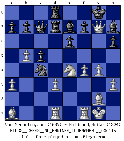 Last move : 1-0 2021 May 27 14:55:21 [Event "FICGS__CHESS__NO_ENGINES_TOURNAMENT__000115"] [Site "FICGS"] [Date "2021.04.09"] [Round "1"] [White "Van Mechelen,Jan"] [Black "Goldmund,Heike"] [Result "1-0"] [WhiteElo "1689"] [BlackElo "1304"] 1.e4 d5 2.exd5 Qxd5 3.Nc3 Qa5 4.g3 Nf6 5.Bg2 c6 6.Nf3 Bg4 7.h3 Bf5 8.O-O e6 9.a3 Bd6 10.Rb1 O-O 11.b4 Qc7 12.d3 Nbd7 13.Bb2 Nb6 14.Ng5 Rad8 15.Qe2 h6 16.Nge4 Nxe4 17.Nxe4 Be7 18.c4 Na4 19.Ba1 Rd7 20.Rbd1 Rfd8 21.f4 c5 22.b5 Nb6 23.g4 Bh7 24.Qb2 Nxc4 25.Qxg7+ 1-0 Scandinavian (centre counter) defense Kingside Castling by player White (move 8) Kingside Castling by player Black (move 10) Player White won this chess game. Follow this game move after move (download)It was clear to me that the vulnerable point of the American Grandmaster (Bobby Fischer) was in double-edged, hanging, irrational positions, where he often failed to find a win even in a won position. (Efim Geller) Schach ist das Spiel, das die Verrückten gesund hält. (Albert Einstein) El Ajedrez es un mar en el cual un mosquito puede beber y un elefante puede bañarse. (Refrán Hindú) Les écrivains ont utilisé les échecs pour analyser les côtés extrêmes de la nature humaine. Dans ce cadre, les échecs offrent un champ d'expérimentation idéal. Mais on pourrait faire la même chose avec la peinture. Et là, en vous référant à Van Gogh, vous ne tirerez pas de conclusion définitive sur les peintres. (Gary Kasparov) The smarter you play, the luckier you'll be. (Mark Pilarski)
