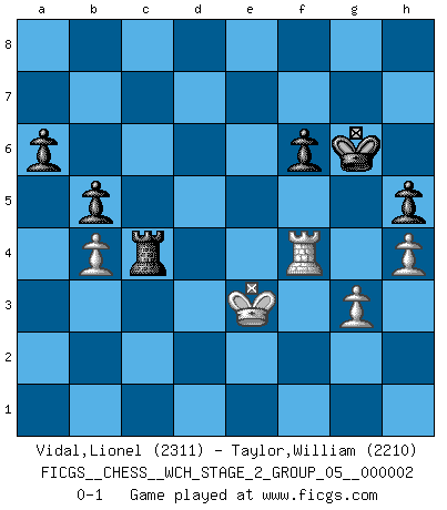 Last move : 0-1 2007 December 9 10:13:42 [Event "FICGS__CHESS__WCH_STAGE_2_GROUP_05__000002"] [Site "FICGS"] [Date "2007.07.11"] [Round "1"] [White "Vidal,Lionel"] [Black "Taylor,William"] [Result "0-1"] [WhiteElo "2311"] [BlackElo "2210"] 1.c4 e5 2.Nc3 Nf6 3.Nf3 Nc6 4.g3 Bb4 5.Bg2 O-O 6.O-O e4 7.Ng5 Bxc3 8.bxc3 Re8 9.f3 e3 10.d3 d5 11.Qb3 Na5 12.Qa3 c6 13.cxd5 cxd5 14.f4 Nc6 15.Rb1 Qc7 16.Bb2 Bg4 17.Nf3 Rac8 18.Qb3 Qd7 19.c4 dxc4 20.Qxc4 Bxf3 21.Bxf3 Ne5 22.Qd4 Nxf3+ 23.Rxf3 Qe6 24.Qa4 b5 25.f5 Qc6 26.Qb4 Nd5 27.Qd4 f6 28.Rc1 Qd7 29.Rxc8 Rxc8 30.Rxe3 Qxf5 31.Rf3 Qe6 32.e4 Nb6 33.Qb4 a6 34.Qb3 Kf7 35.Kg2 Na4 36.Bd4 Qxb3 37.axb3 Nc5 38.b4 Nb3 39.Bb2 Nc1 40.Bxc1 Rxc1 41.e5 Rc2+ 42.Kg1 Rc3 43.exf6 gxf6 44.Kf2 Rb3 45.Rf4 Rxd3 46.Rh4 Kg6 47.Rg4+ Kf5 48.Rh4 Rb3 49.h3 Kg6 50.Rg4+ Kf7 51.Rd4 h5 52.Rh4 Kg6 53.Rf4 Rc3 54.h4 Rc1 55.Ke3 Rb1 56.Kf3 Rb3+ 57.Kg2 Rb2+ 58.Kf3 Rc2 59.Ke3 Rc4 0-1 English Opening Kingside Castling by player Black (move 5) Kingside Castling by player White (move 6) Player Black won this chess game. Follow this game move after move (download)Chess is the gymnasium of the mind. (Blaise Pascal) Vom Schach wurde gesagt das Leben sei dafür nicht lange genug. Aber das ist der Fehler des Lebens, nicht des Schach'. (Irving Chernev) Una buena ofensiva y una buena defensa, comienzan ambas con un buen desarrollo. (Bruce A. Moon) Des idées, des idées, j'en ai cent, j'en ai mille. Des bonnes, des mauvaises, applicables, irréalisables... Il suffit de faire le tri ! (Roos) Dave, my mind is going. I can feel it. (HAL 9000 in 2001, a space odyssey)