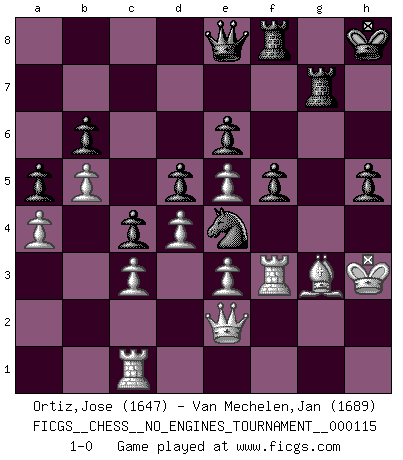 Last move : 1-0 2021 November 6 6:42:4 [Event "FICGS__CHESS__NO_ENGINES_TOURNAMENT__000115"] [Site "FICGS"] [Date "2021.04.09"] [Round "1"] [White "Ortiz,Jose"] [Black "Van Mechelen,Jan"] [Result "1-0"] [WhiteElo "1647"] [BlackElo "1689"] 1.g3 Nf6 2.Bg2 d5 3.d4 g6 4.f4 Bg7 5.e3 O-O 6.Ne2 Bf5 7.Nbc3 c6 8.b4 a5 9.b5 c5 10.O-O c4 11.h3 h5 12.a4 Nbd7 13.Bd2 Ne4 14.Nxe4 Bxe4 15.c3 Bxg2 16.Kxg2 f5 17.h4 Nf6 18.Be1 Ne4 19.Qc1 b6 20.Qc2 e6 21.Rc1 Rc8 22.Ng1 Bf6 23.Nf3 Rc7 24.Ne5 Bxe5 25.fxe5 g5 26.Rf3 Rg7 27.Kh2 Kh8 28.Kg2 gxh4 29.Qe2 Qe8 30.Kh3 hxg3 31.Bxg3 1-0 Benko's Opening Kingside Castling by player Black (move 5) Kingside Castling by player White (move 10) Player White won this chess game. Follow this game move after move (download)Bobby is the most misunderstood, misquoted celebrity walking the face of this earth. (Yasser Seirawan) Fischer: 'Remis!?' Uhlmann: 'Aber es muss doch dreimal Zugwiederholung sein!' Fischer: 'Sie nehmen das Remis an, wie ich es sage, sonst spiele ich weiter und werde Sie dann schlagen!' (Robert James Fischer) Jugadores de primera clase pierden en contra de jugadores de segunda clase porque los jugadores de segunda clase a veces juegan una partida de primer clase. (Siegbert Tarrasch) La vie et les Echecs sont tous les deux une lutte constante. (Lasker) There is a great deal of difference between an eager man who wants to read a book and a tired man who wants a book to read. (G.K. Chesterton)