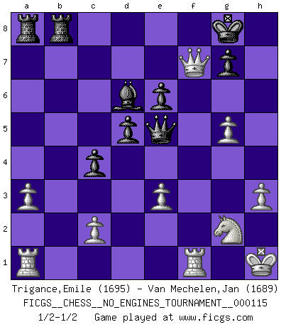 Last move : 1/2-1/2 2021 June 12 17:15:40 [Event "FICGS__CHESS__NO_ENGINES_TOURNAMENT__000115"] [Site "FICGS"] [Date "2021.04.09"] [Round "1"] [White "Trigance,Emile"] [Black "Van Mechelen,Jan"] [Result "1/2-1/2"] [WhiteElo "1695"] [BlackElo "1689"] 1.b3 d5 2.Bb2 Bf5 3.Nf3 e6 4.e3 Nf6 5.Be2 h6 6.O-O Be7 7.d3 O-O 8.Nbd2 a5 9.Ne1 a4 10.a3 c5 11.f4 Nc6 12.g4 Bh7 13.Ng2 axb3 14.Nxb3 b5 15.Nd2 c4 16.dxc4 bxc4 17.h3 Nd7 18.Nf3 Qb6 19.Bd4 Nxd4 20.Nxd4 Nc5 21.Bf3 Be4 22.Qd2 Bxf3 23.Nxf3 Ne4 24.Qe1 Bc5 25.Kh2 Rfb8 26.g5 hxg5 27.Nxg5 Nxg5 28.fxg5 Qd6+ 29.Kh1 Qe5 30.Qf2 Bd6 31.Qxf7+ Kh8 32.Qh5+ Kg8 33.Qf7+ Kh8 34.Qh5+ Kg8 35.Qf7+ 1/2-1/2 Nimzovich-Larsen attack : Classical variation Kingside Castling by player White (move 6) Kingside Castling by player Black (move 7) This chess game ended in a draw. Follow this game move after move (download)I like to say that Bobby Fischer was the greatest player ever. But what made Fischer a genius was his ability to blend an American freshness and pragmatism with Russian ideas about strategy. (Bruce Pandolfini) Gott hat gewollt, dass ich Champion werde. (Surab Azmajparaschvili) Nunca nadie ha ganado una partida de Ajedrez rindiendose. (Unknown) Des idées, des idées, j'en ai cent, j'en ai mille. Des bonnes, des mauvaises, applicables, irréalisables... Il suffit de faire le tri ! (Roos) Either move or be moved. (Ezra Pound)