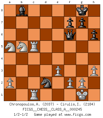 Last move : 1/2-1/2 2021 June 11 23:33:41 [Event "FICGS__CHESS__CLASS_A__000245"] [Site "FICGS"] [Date "2021.04.12"] [Round "1"] [White "Chronopoulos,Antonis"] [Black "Cirulis,Ilmars"] [Result "1/2-1/2"] [WhiteElo "2037"] [BlackElo "2184"] 1.d4 d5 2.c4 c6 3.Nf3 Nf6 4.Nc3 e6 5.Bg5 Be7 6.e3 O-O 7.Bd3 Nbd7 8.O-O h6 9.Bh4 dxc4 10.Bxc4 b5 11.Be2 a6 12.Ne5 Bb7 13.Bxf6 Nxf6 14.Nd3 Qc7 15.Rc1 Bd6 16.h3 e5 17.dxe5 Bxe5 18.Bf3 Rfd8 19.Qe2 Qe7 20.b4 a5 21.Nxb5 axb4 22.Bxc6 Bxc6 23.Rxc6 Ra5 24.Rc5 Bb8 25.Rfc1 Ne4 26.Nxb4 Rd2 27.Qxd2 Nxd2 28.Nc6 Qf6 29.Nxa5 1/2-1/2 QGD Slav : 4.Nc3 Kingside Castling by player Black (move 6) Kingside Castling by player White (move 8) This chess game ended in a draw. Follow this game move after move (download)I love all positions. Give me a difficult positional game, I will play it. But totally won positions, I cannot stand them. (Hein Donner) Der Umstand, daß uns eine 7 Stunden Zeitkontrolle ermöglicht eine großartige, tiefe Partie zu spielen, ist für die Massenmedien nicht weiter von Bedeutung. (Alexej Shirov) El Ajedrez es el arte del análisis. (Mikhail Botvinnik) Le temps de noter son nom sur la feuille de partie, j'étais déjà en zeitnot ! D'un modeste amateur apparié lors de la première ronde d'un open contre le grand-maître Azmaïparashvili. If only faces could talk... (Pat Summerall, Sportscaster during the Super Bowl)