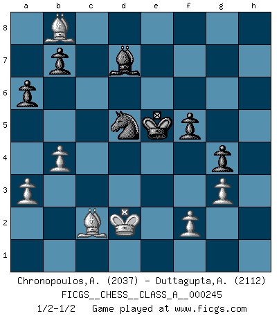 Last move : 1/2-1/2 2021 December 8 15:35:36 [Event "FICGS__CHESS__CLASS_A__000245"] [Site "FICGS"] [Date "2021.04.12"] [Round "1"] [White "Chronopoulos,Antonis"] [Black "Duttagupta,Aniruddha"] [Result "1/2-1/2"] [WhiteElo "2037"] [BlackElo "2112"] 1.d4 d5 2.c4 e6 3.Nc3 c5 4.cxd5 exd5 5.Nf3 Nc6 6.dxc5 d4 7.Na4 Bxc5 8.Nxc5 Qa5+ 9.Bd2 Qxc5 10.Rc1 Qb6 11.e3 Nf6 12.Bc4 dxe3 13.Bxe3 Qb4+ 14.Bd2 Qe7+ 15.Be2 O-O 16.O-O Be6 17.Re1 Qd6 18.a3 Rfe8 19.Be3 Qxd1 20.Rcxd1 Nd5 21.Bc1 Nde7 22.b4 a6 23.Bb2 h6 24.h3 Rad8 25.Rxd8 Rxd8 26.Rd1 Rxd1+ 27.Bxd1 f6 28.Nd4 Nxd4 29.Bxd4 Kf7 30.Bc5 g6 31.h4 Bd7 32.g3 g5 33.Bb3+ Be6 34.Bd1 Bd7 35.Kg2 Bc6+ 36.Kf1 Nd5 37.hxg5 hxg5 38.Bb3 Bb5+ 39.Ke1 Ke6 40.Bd4 f5 41.Be3 g4 42.Kd2 Ke5 43.Ba7 Be8 44.Bc2 Bd7 45.Bb8+ 1/2-1/2 QGD : Tarrasch defense Kingside Castling by player Black (move 15) Kingside Castling by player White (move 16) This chess game ended in a draw. Follow this game move after move (download)No one ever won a game by resigning. (Unknown) Wenn man heute mit 14 Jahren noch kein GM ist, kann man es vergessen. (Viswanathan Anand) No existe un remordimiento como el remordimiento del Ajedrez. (H. G. Wells) Les Echecs, c'est l'art de la guerre sans les charniers, c'est la résurrection des morts tombés au champ d'honneur, l'espoir perpétuel, la suprématie de l'intelligence sur la force, la culture de l'esprit. (F. Szpiner) When the going gets tactical, the computers get going. (Hyatt)