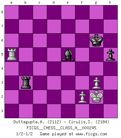 Last move : 1/2-1/2 2021 October 22 21:2:7 [Event "FICGS__CHESS__CLASS_A__000245"] [Site "FICGS"] [Date "2021.04.12"] [Round "1"] [White "Duttagupta,Aniruddha"] [Black "Cirulis,Ilmars"] [Result "1/2-1/2"] [WhiteElo "2112"] [BlackElo "2184"] 1.d4 f5 2.Bg5 g6 3.Nc3 Bg7 4.Nf3 Nf6 5.e3 d5 6.Bf4 c6 7.Bd3 O-O 8.O-O Be6 9.Rc1 Ne4 10.Ne2 Nd7 11.c4 dxc4 12.Bxc4 Bxc4 13.Rxc4 Qe8 14.Ng3 Qf7 15.b3 Rad8 16.Bc7 Nd6 17.Bxd8 Nxc4 18.bxc4 Rxd8 19.Qb3 b5 20.Rc1 Bf6 21.cxb5 Qxb3 22.axb3 cxb5 23.Rc7 e5 24.Rxa7 exd4 25.exd4 Nf8 26.Ne2 Ne6 27.Rb7 Nxd4 28.Nexd4 Bxd4 29.Rxb5 Bf6 30.g3 Rd3 31.Kg2 Kf7 32.h4 h6 33.h5 gxh5 34.Rxf5 Rxb3 35.Rxh5 Kg6 36.Ra5 h5 37.Ne5+ Bxe5 1/2-1/2 Dutch, 2.Bg5 variation Kingside Castling by player Black (move 7) Kingside Castling by player White (move 8) 10 pieces endgame at move 34 : White KRNPP , Black KRBPP WHITE : King + 1 Rook 1 Knight 2 Pawns BLACK : King + 1 Rook 1 Bishop 2 Pawns 9 pieces endgame at move 35 : White KRNPP , Black KRBP WHITE : King + 1 Rook 1 Knight 2 Pawns BLACK : King + 1 Rook 1 Bishop 1 Pawn 8 pieces endgame at move 37 : White KRPP , Black KRBP WHITE : King + 1 Rook 2 Pawns BLACK : King + 1 Rook 1 Bishop 1 Pawn This chess game ended in a draw. Follow this game move after move (download)All I want to do, ever, is just play Chess. (Bobby Fischer) Um sich vor der Gefahr einer Erkältung zu schützen, sorge der wanderlustige König beizeiten für ein brauchbares Versteck. (Aaron Nimzowitsch) Desconfianza es la característica mas necesaria de un jugador de Ajedrez. (Siegbert Tarrasch) L'action d'une oeuvre littéraire se déroule sur un champ de bataille. Les masques et les types du drame moderne correspondent aux pièces du jeu d'échecs. L'intrigue correspond aux coups et aux gambits, c'est à dire aux techniques du jeu telles qu'utilisées et interprétées par les joueurs. Les tactiques et les péripéties [mouvements] correspondent aux coups exécutés par l'adversaire. (Viktor Shklovsky) A cynic is a man who knows the price of everything but the value of nothing. (Oscar Wilde)