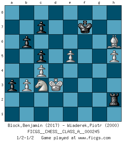 Last move : 1/2-1/2 2021 June 4 16:12:53 [Event "FICGS__CHESS__CLASS_A__000245"] [Site "FICGS"] [Date "2021.04.12"] [Round "1"] [White "Block,Benjamin"] [Black "Wiaderek,Piotr"] [Result "1/2-1/2"] [WhiteElo "2017"] [BlackElo "2000"] 1.e4 e5 2.Nf3 Nc6 3.Bb5 Nf6 4.O-O Nxe4 5.d4 Nd6 6.Bxc6 dxc6 7.dxe5 Nf5 8.Qxd8+ Kxd8 9.Nc3 Bd7 10.h3 h6 11.Bf4 g5 12.Bh2 b6 13.g4 Ng7 14.Ne4 c5 15.Nfd2 Be7 16.f4 gxf4 17.Rxf4 Be6 18.Raf1 h5 19.Rxf7 Bxf7 20.Rxf7 Ne6 21.Nf6 Rf8 22.Rxf8+ Bxf8 23.gxh5 Ke7 24.Nde4 Bh6 25.Kg2 a5 26.h4 a4 27.Nd5+ Kf7 28.Kf3 a3 29.b3 Rg8 30.Bg3 Rd8 31.c4 Rg8 32.Nef6 Nd4+ 33.Kf2 Rg7 34.Bf4 Nf5 35.Ne3 Nxe3 36.Bxh6 Rg2+ 37.Kxe3 Rxa2 38.Ne4 Rh2 39.Nc3 Rxh4 40.Kd3 Rh2 1/2-1/2 Ruy Lopez : Berlin defense, Open variation Kingside Castling by player White (move 4) This chess game ended in a draw. Follow this game move after move (download)Bobby just drops the pieces and they fall on the right squares. (Miguel Najdorf) Früher wurde jeder komplizierte Zug, jedes interessante Opfer mit großem Beifall und Enthusiasmus aufgenommen. Heute schaltet man einfach seinen Fritz an, und man kann sehen, was los ist, ob der Zug geht oder nicht. (Vladimir Kramnik) Aunque la mayoría de la gente disfruta observar las partidas de los grandes Maestros de ataque, algunos de los jugadores mas notables en la historia han sido los jugadores silenciosos posicionales. Lentamente ellos te aplastan despojandote de tu espacio, congestionando tus piezas y dejandote virtualmente sin nada que hacer. (Yasser Seirawan) Les erreurs sont comme les malheurs, elles n'arrivent jamais seules. (Siegbert Tarrasch) When you don't know what to do, walk fast and look worried. (Anonymous)
