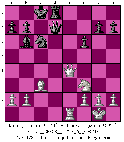 Last move : 1/2-1/2 2021 June 19 22:52:6 [Event "FICGS__CHESS__CLASS_A__000245"] [Site "FICGS"] [Date "2021.04.12"] [Round "1"] [White "Domingo,Jordi"] [Black "Block,Benjamin"] [Result "1/2-1/2"] [WhiteElo "2011"] [BlackElo "2017"] 1.e4 c5 2.Nf3 d6 3.c3 Nf6 4.Be2 e5 5.O-O Be7 6.Bb5+ Bd7 7.Bxd7+ Qxd7 8.Re1 Nc6 9.d4 exd4 10.cxd4 d5 11.exd5 Nxd5 12.dxc5 O-O-O 13.Qb3 Bxc5 14.Qc4 Bb6 15.Bd2 Rhe8 16.Nc3 Rxe1+ 17.Rxe1 Nxc3 18.Bxc3 f6 19.Qe4 Qd3 20.Qg4+ Qd7 21.Qe4 Qd3 22.Qg4+ Qd7 23.Qe4 1/2-1/2 Sicilian Kingside Castling by player White (move 5) Queenside Castling by player Black (move 12) This chess game ended in a draw. Follow this game move after move (download)Life is like a game of Chess, changing with each move. (Chinese proverb) Wenn ich Weiß habe gewinne ich weil ich Weiß habe, wenn ich Schwarz habe gewinne ich weil ich Bogoljubov bin. (Efim Bogoljubov) Si no le temes a Spassky, entonces elimino el elemento del dinero. (Jim Slater) Echiquier : carré parfait, comme la Jérusalem nouvelle décrite par l'auteur de l'Apocalypse, huit cases sur huit, exaltation du chiffre 4, symbole du cosmos aux quatre horizons... où le noir et le blanc, l'ombre et la lumière, le mal et le bien s'entremêlent et se conjuguent. (Robert Couffignal, Le Gambit du poète) 'preceded by its own quotation yields a falsehood' preceded by its own quotation yields a falsehood. (W. V. O. Quine - Set Theory And Its Logic, 1953)