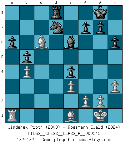 Last move : 1/2-1/2 2021 May 5 16:11:53 [Event "FICGS__CHESS__CLASS_A__000245"] [Site "FICGS"] [Date "2021.04.12"] [Round "1"] [White "Wiaderek,Piotr"] [Black "Gossmann,Ewald"] [Result "1/2-1/2"] [WhiteElo "2000"] [BlackElo "2024"] 1.d4 Nf6 2.c4 e6 3.Nc3 d5 4.Nf3 Bb4 5.Qa4+ Nc6 6.e3 O-O 7.Qc2 Re8 8.Bd2 h6 9.a3 Bf8 10.h3 b6 11.cxd5 exd5 12.Bb5 Bd7 13.Ba6 Bc8 14.Bd3 Nb8 15.b4 c5 16.Bb5 cxb4 17.axb4 Re7 18.Ne5 Rc7 19.Qb3 Be6 20.O-O Nbd7 21.Nc6 Qc8 22.Ba6 Qe8 23.Qa4 Ne4 24.Nxe4 dxe4 25.Bb5 Bd6 26.Rfc1 a6 27.Ne5 Bxe5 28.dxe5 Qd8 29.Rxc7 Qxc7 30.Rc1 Qxe5 31.Bc6 b5 32.Qa1 Qxa1 33.Rxa1 Rd8 34.Be1 1/2-1/2 Queen's pawn game Kingside Castling by player Black (move 6) Kingside Castling by player White (move 20) This chess game ended in a draw. Follow this game move after move (download)The King is a fighting piece. Use it ! (Wilhelm Steinitz) Ein Teil des Fehlers ist immer korrekt. (Savielly Grigorievitsch Tartakower) Yo no creo en la psicología. Yo creo en las buenas movidas. (Bobby Fischer) Le profane ne songe pas à la somme de jouissance dont il se prive, qui méconnaît ce jeu aux ressources aussi variées que passionnantes. (Jean-Marie Jeanton-Lamarche) Men never do evil so completely and cheerfully as when they do it from religious conviction. (Blaise Pascal)