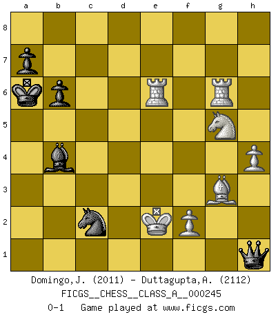Last move : 0-1 2022 April 24 12:50:6 [Event "FICGS__CHESS__CLASS_A__000245"] [Site "FICGS"] [Date "2021.04.12"] [Round "1"] [White "Domingo,Jordi"] [Black "Duttagupta,Aniruddha"] [Result "0-1"] [WhiteElo "2011"] [BlackElo "2112"] 1.e4 c6 2.d4 d5 3.e5 c5 4.c4 cxd4 5.Nf3 Bg4 6.Qxd4 Bxf3 7.gxf3 Nc6 8.Qxd5 Qc7 9.f4 e6 10.Qe4 O-O-O 11.Bg2 f5 12.exf6 Nxf6 13.Qxe6+ Kb8 14.Bxc6 Bb4+ 15.Nc3 Rhe8 16.Bxe8 Rxe8 17.Qxe8+ Nxe8 18.Bd2 Nd6 19.O-O-O Nxc4 20.Rhe1 Qc6 21.a3 Nxa3 22.f5 b6 23.Re6 Qc5 24.Rg1 g6 25.Rg3 Nc4 26.fxg6 hxg6 27.R3xg6 Qa5 28.Bf4+ Kb7 29.Ne4 Ka6 30.Kc2 Qa4+ 31.b3 Qa2+ 32.Kd3 Qxb3+ 33.Ke2 Nb2 34.Kf1 Qh3+ 35.Kg1 Nd3 36.Ng5 Qg4+ 37.Bg3 Qd1+ 38.Kg2 Ne1+ 39.Kf1 Qd5 40.h4 Qh1+ 41.Ke2 Nc2 0-1 This chess game has been lost on time (started : 2021.04.12 17:37:17) Caro-Kann : Advance variation Queenside Castling by player Black (move 10) Queenside Castling by player White (move 19) Player Black won this chess game. Follow this game move after move (download)One doesn't have to play well, it's enough to play better than your opponent. (Siegbert Tarrasch) Ich verlor meine Bürgerrechte, mein Gehalt wurde mir nicht mehr bezahlt und ich wurde zensiert und durfte nicht mehr ins Ausland reisen. [nach dem Match Fischer-Taimanov 6:0] (Mark Taimanov) Yo considero que Fischer es uno de los expertos mas grandes de aperturas de siempre. (Keith Hayward) Celui qui prend des risques peut perdre, celui qui n'en prend pas perd toujours. (Xavier Tartacover) It's not a bug - it's an undocumented feature. (Anonymous)