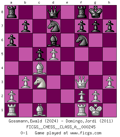 Last move : 0-1 2021 July 9 3:49:46 [Event "FICGS__CHESS__CLASS_A__000245"] [Site "FICGS"] [Date "2021.04.12"] [Round "1"] [White "Gossmann,Ewald"] [Black "Domingo,Jordi"] [Result "0-1"] [WhiteElo "2024"] [BlackElo "2011"] 1.d4 d5 2.c4 dxc4 3.Nf3 c5 4.Nc3 Nf6 5.d5 e6 6.e4 exd5 7.exd5 Bd6 8.Bxc4 O-O 9.O-O Bg4 10.h3 Bxf3 11.Qxf3 Nbd7 12.b3 a6 0-1 QGA : 3.Nf3 Kingside Castling by player Black (move 8) Kingside Castling by player White (move 9) Player Black won this chess game. Follow this game move after move (download)Chess is a sea in which a gnat may drink and an elephant may bathe. (Hindu proverb) Das Spiel gibt uns die Genugtuung, die das Leben uns versagt. (Emanuel Lasker) No es tiempo de jugar al Ajedrez cuando la casa esta en llamas. (Proverbio Italiano) Le système Elo représente seulement une moyenne. Il est simplement un indicateur de votre stabilité. (Anatoli Karpov) Nothing is more important for teaching us to understand the concepts we have than constructing fictitious ones. (Ludwig Wittgenstein)