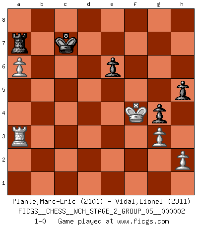 Last move : 1-0 2007 December 9 10:13:6 [Event "FICGS__CHESS__WCH_STAGE_2_GROUP_05__000002"] [Site "FICGS"] [Date "2007.07.11"] [Round "1"] [White "Plante,Marc-Eric"] [Black "Vidal,Lionel"] [Result "1-0"] [WhiteElo "2101"] [BlackElo "2311"] 1.e4 e6 2.d4 d5 3.Nc3 dxe4 4.Nxe4 Bd7 5.Nf3 Bc6 6.Bd3 Nd7 7.O-O Ngf6 8.Ng3 Be7 9.b3 O-O 10.Bb2 Bxf3 11.Qxf3 c6 12.c4 Qa5 13.a3 Rfe8 14.Rfe1 Rad8 15.Rad1 Nf8 16.b4 Qc7 17.Ne4 Nxe4 18.Bxe4 Bf6 19.Qh5 Rd7 20.Rd3 h6 21.Red1 Red8 22.g3 Qb6 23.Rf3 Bg5 24.Rb3 Bf6 25.Rf3 Bg5 26.Bc2 a5 27.Rb3 axb4 28.Rxb4 Qc7 29.Rb3 Bf6 30.Rb1 Rb8 31.Qg4 b5 32.cxb5 Rxb5 33.Rxb5 cxb5 34.Bd3 Rd5 35.Qd1 Bxd4 36.Bxd4 Qd8 37.Rb4 e5 38.Qb3 exd4 39.Rxb5 Rd6 40.a4 Rc6 41.Qd5 Qxd5 42.Rxd5 Ne6 43.Kf1 Rc3 44.Ke2 Ra3 45.a5 Kf8 46.a6 g5 47.Bc4 Ke7 48.Bb5 Kf8 49.Rd6 Ra2+ 50.Kd3 Ra3+ 51.Ke4 Ra5 52.Bc4 Ke7 53.Rc6 Kd7 54.Rb6 g4 55.Bxe6+ fxe6 56.Kxd4 Ra2 57.Kc3 h5 58.Kb3 Ra5 59.Kc2 Ra2+ 60.Kc3 Rxf2 61.Rb2 Rf3+ 62.Kc4 Kc7 63.Rb7+ Kc6 64.Rb3 Rf7 65.Kd4 Ra7 66.Ra3 Kd6 67.Ke4 Kc7 68.Kf4 1-0 French : Fort Knox variation Kingside Castling by player White (move 7) Kingside Castling by player Black (move 9) 10 pieces endgame at move 60 : White KRPPP , Black KRPPP WHITE : King + 1 Rook 3 Pawns BLACK : King + 1 Rook 3 Pawns Player White won this chess game. Follow this game move after move (download)Examine moves that smite! A good eye for smites is far more important than a knowledge of strategical principles. (Purdy) Ich organisiere ein großes Turnier, was mich etwa 120000 Dollar kostet. Ich denke, das ist das erste Mal in der Schachgeschichte, daß ein Schachgroßmeister auch als Mäzen auftritt. (Miguel Najdorf) El tablero es el mundo, las piezas es el fenomeno del universo, las reglas del juego son lo que llamamos leyes de la naturaleza y el jugador del lado opuesto, se encuentra oculto a nuestra vista. (Thomas Huxley) J'ai toujours senti une vague pitié pour l'homme qui ne connaît rien aux échecs, tout comme j'en aurais pour un homme ignorant de l'amour. Les Echecs, comme la musique ou comme l'amour, ont le pouvoir de rendre heureux. (Siegbert Tarrasch) Life is like a game of cards: the hand you are dealt represents determinism; the way you play it is free will. (Jawaharlal Nehru)